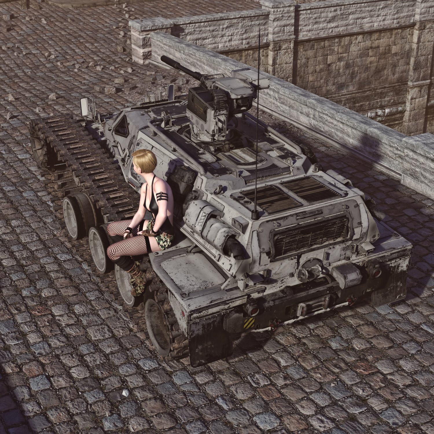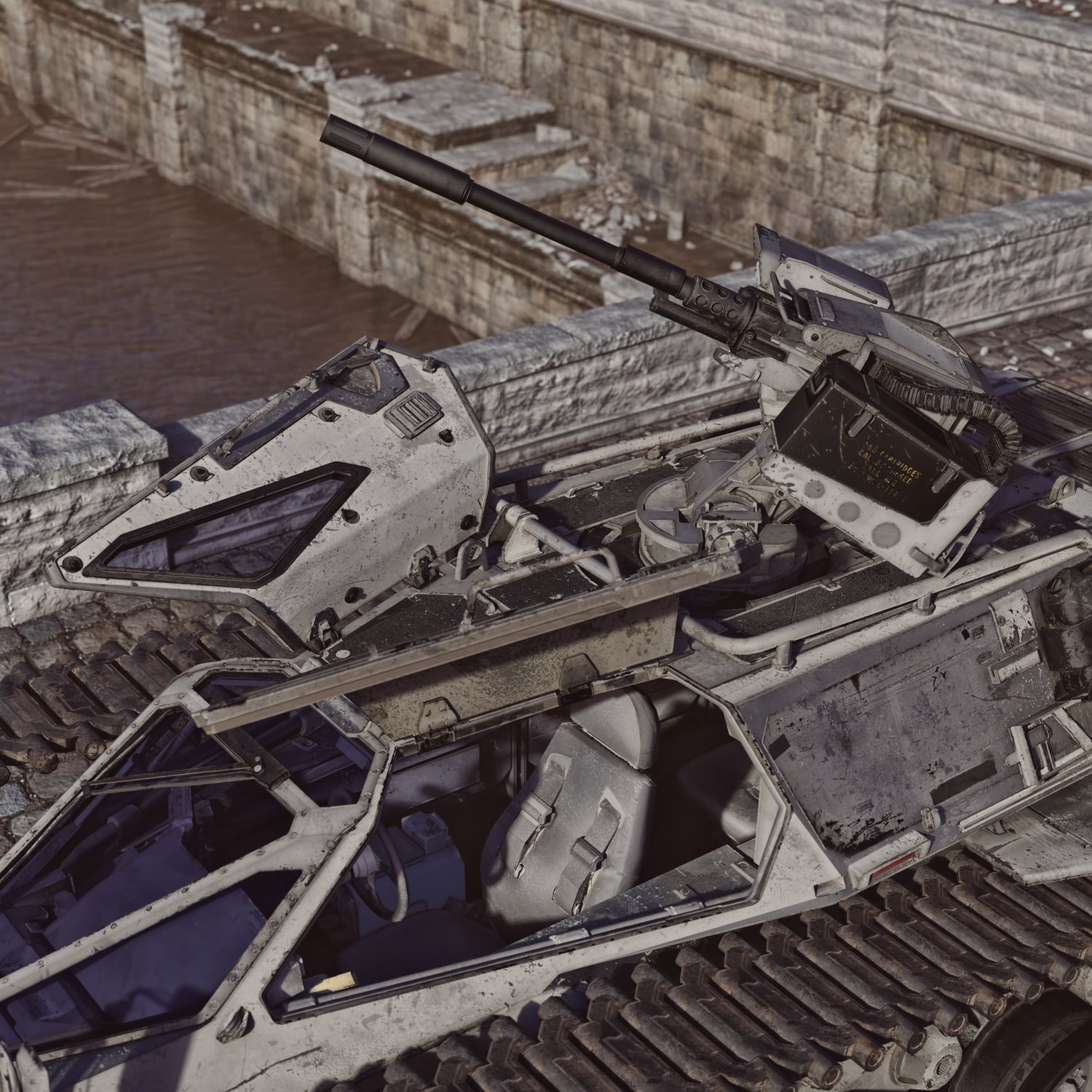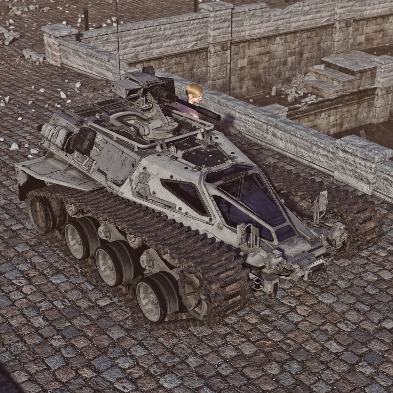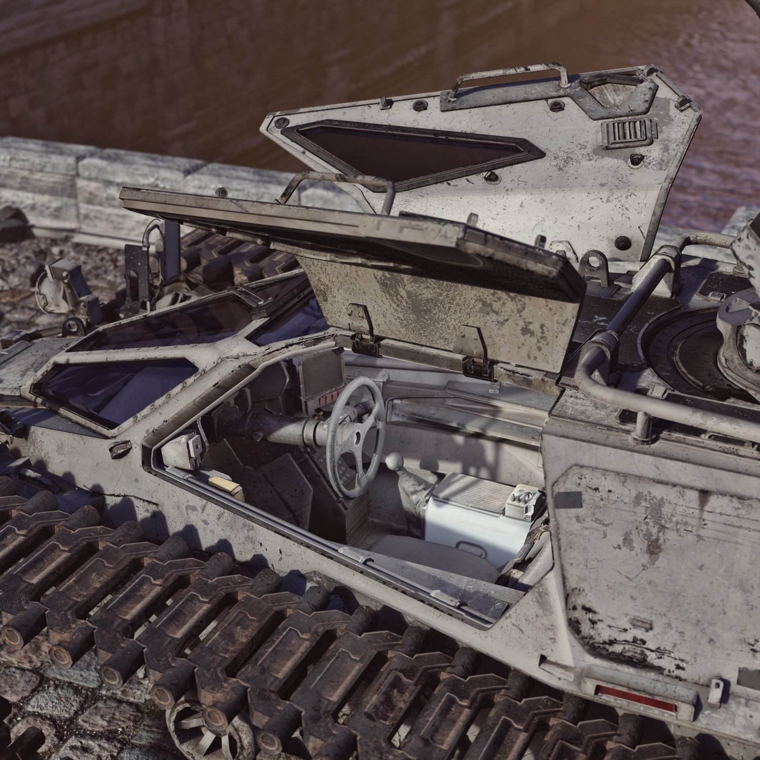 A cool scifi reconnaissance and light support armored vehicle for providing intel and fire support. Essentially a futuristic armored light tank, fast and nimble. Has a good gun and cool doors that open up. Gun, doors, steering wheel rigged for realistic pics. Has 2 seats, one for the gunner, one for the driver. Good for transportation and for combat with lightly to moderate armored enemies of future warfare. The prop is converted and rigged for DAZ.