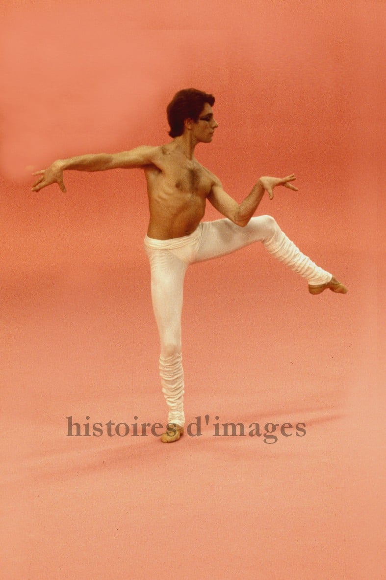A vibrant moment from Maurice Béjart’s Bhakti, captured in a rare color photograph featuring dancers Paolo Bortoluzzi.