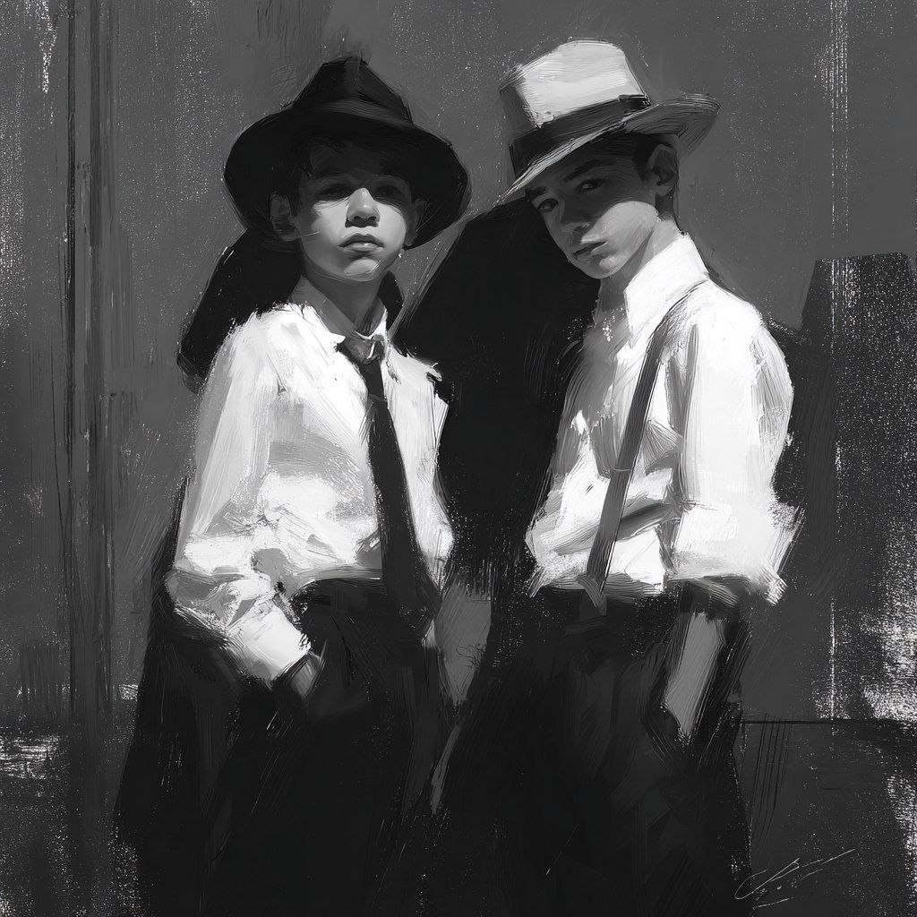 Capture a bold, cinematic mood with this Mafia Kids Sketch, featuring two young characters in a full-body composition inspired by a 1920s American city setting. Rendered in a minimalistic black and white ink style with expressive, high-contrast brushwork, the artwork channels a vintage noir atmosphere.