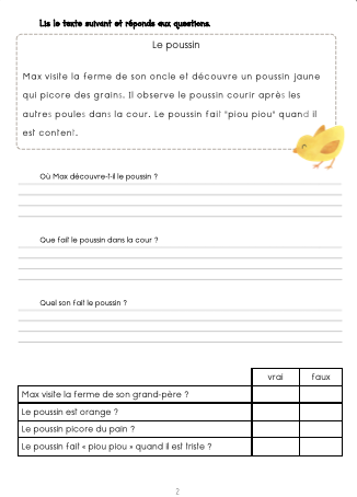 6 histoires sur le thème de la ferme. L'élève doit lire le texte puis répondre à 3 questions par une phrase puis remplir un tableau "vrai-faux".