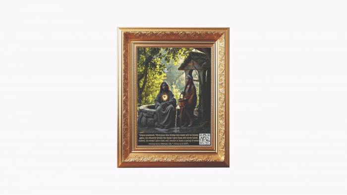 Artistic depiction of Jesus at the well, breaking barriers with the Samaritan woman. Embrace inclusion and spiritual renewal in this masterpiece!