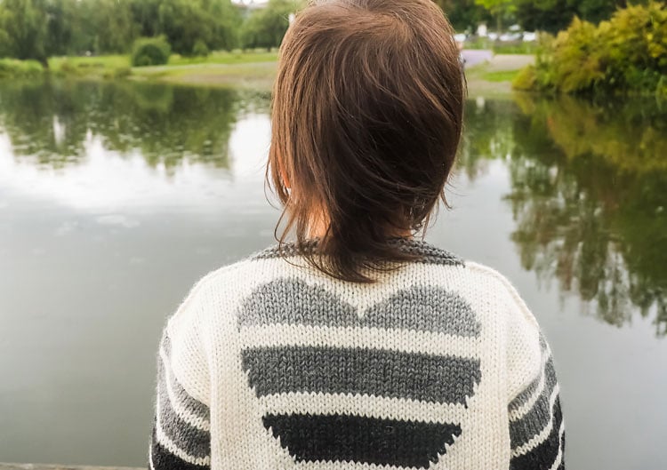 Jacket is a very roomy fit; it’s perfect for layers. Worked bottom up in pieces and seamed with modified set-in sleeves. Heart motif on back is worked in intarsia. Front bands and neck edging are applied after assembly.