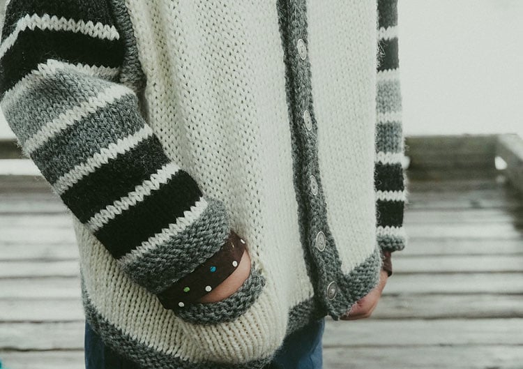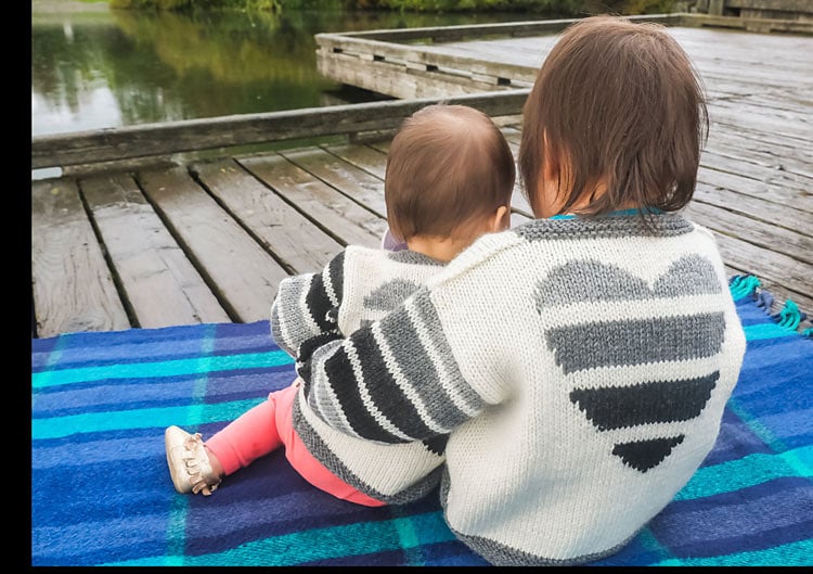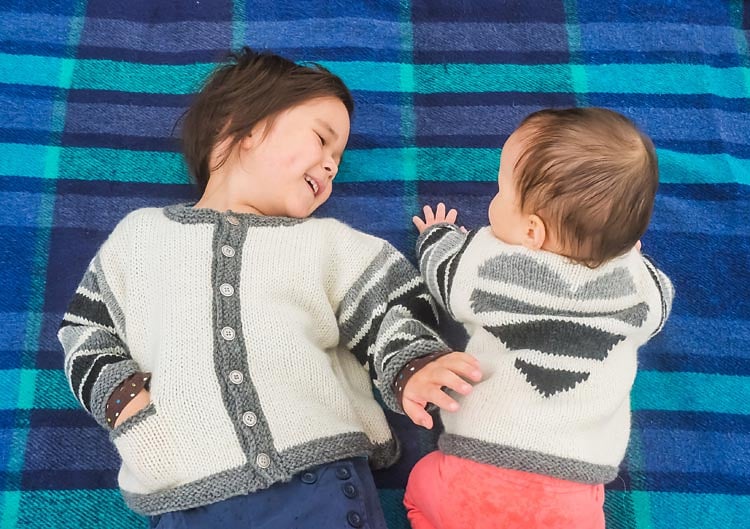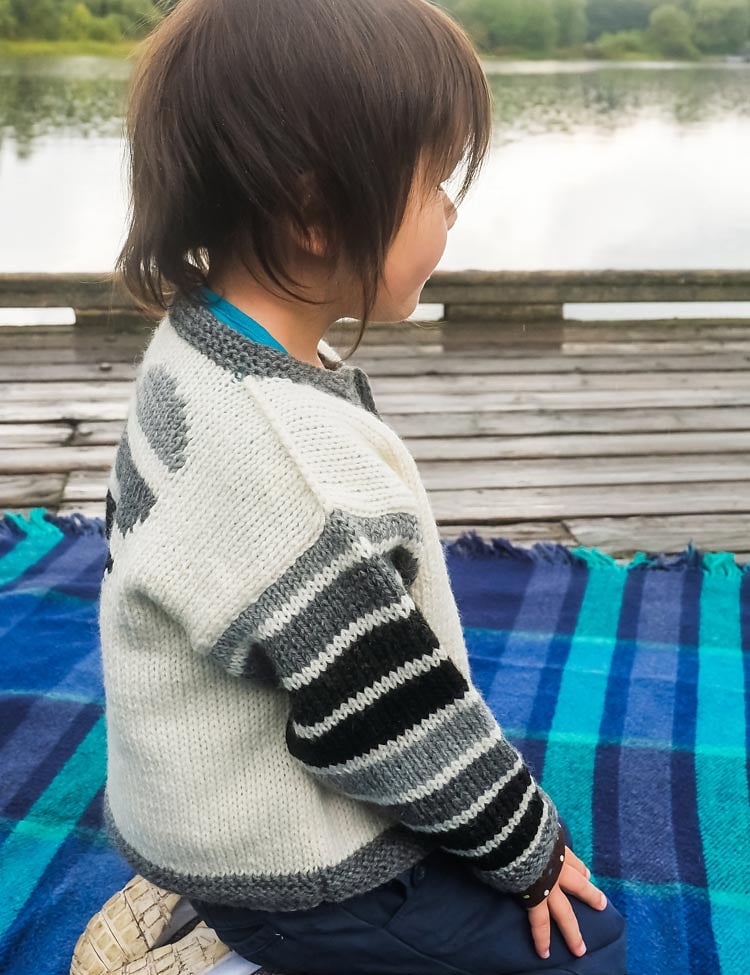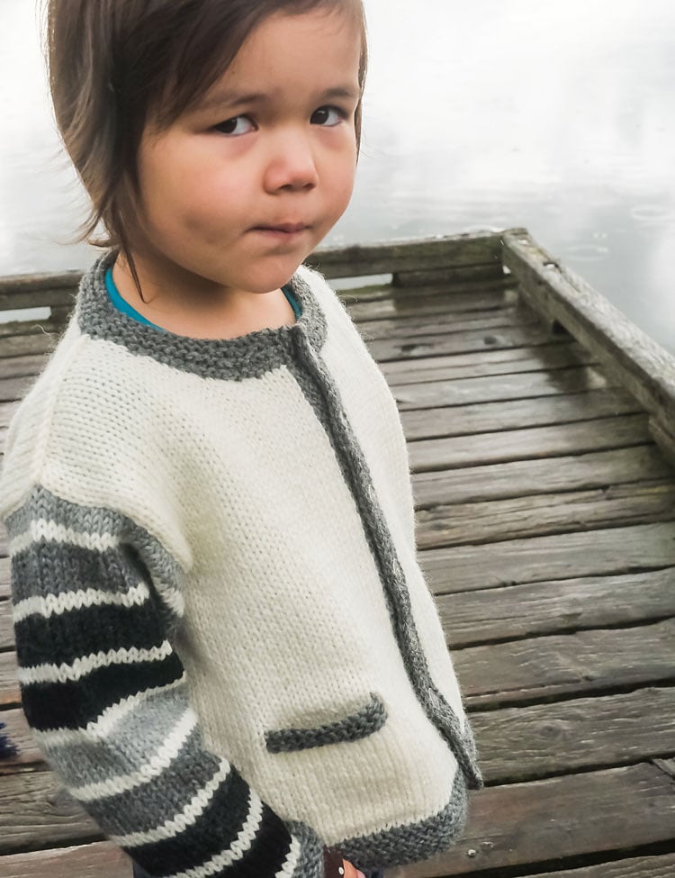 Monochrome stripes give a modern twist to the classic heart motif on this birth-to-teen sized jacket. A smart inset pocket and the clever non-flipping hem, cuffs and front bands add the final polish. Swap Hudson Bay Company colours for the black and grey, and no Canadian will be able to resist!
