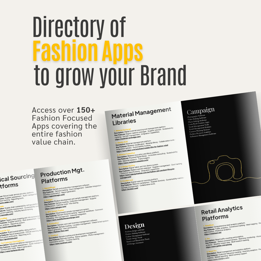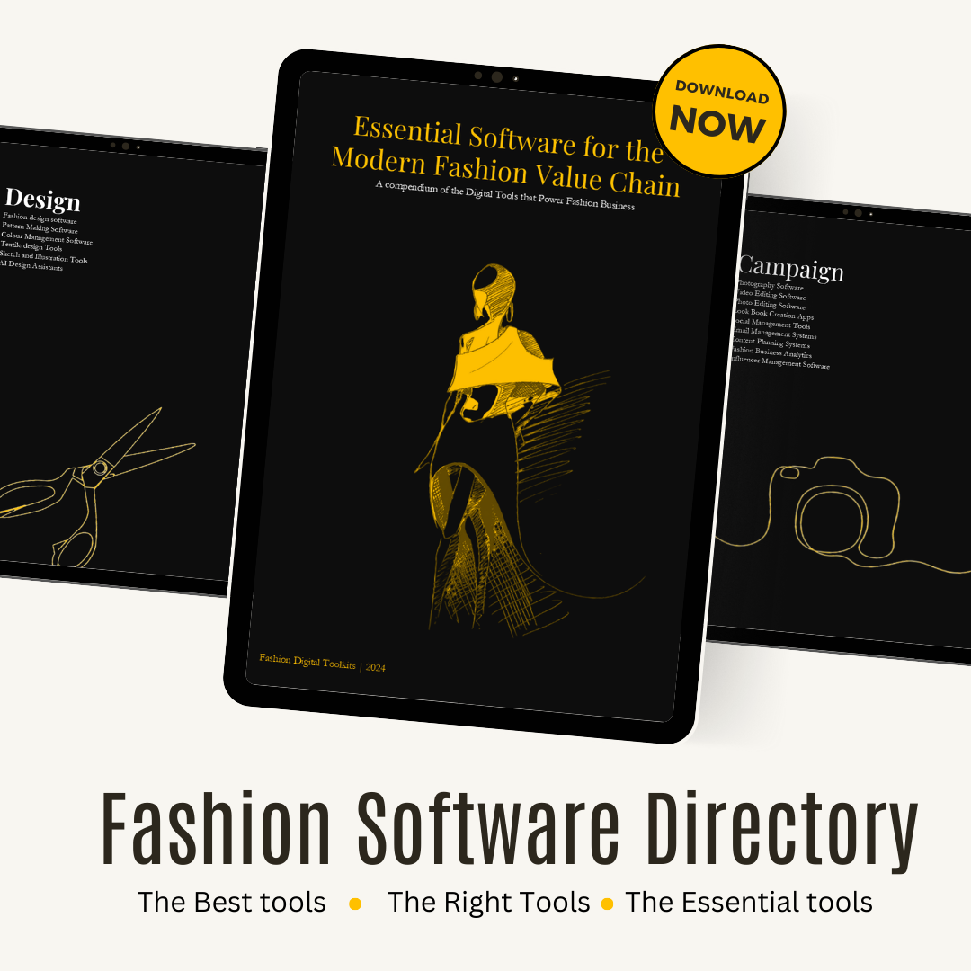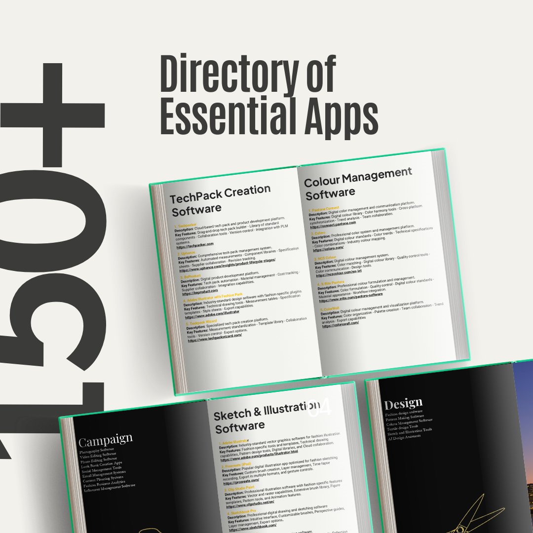 Fashion Software Directory for Fashion Brands - Essential Apps for the Modern Fashion Value Chain" is your definitive guide to building a powerful digital ecosystem for your fashion business. From initial design to final sale, this practical guide maps out the crucial software and platforms that drive today's successful fashion brands.