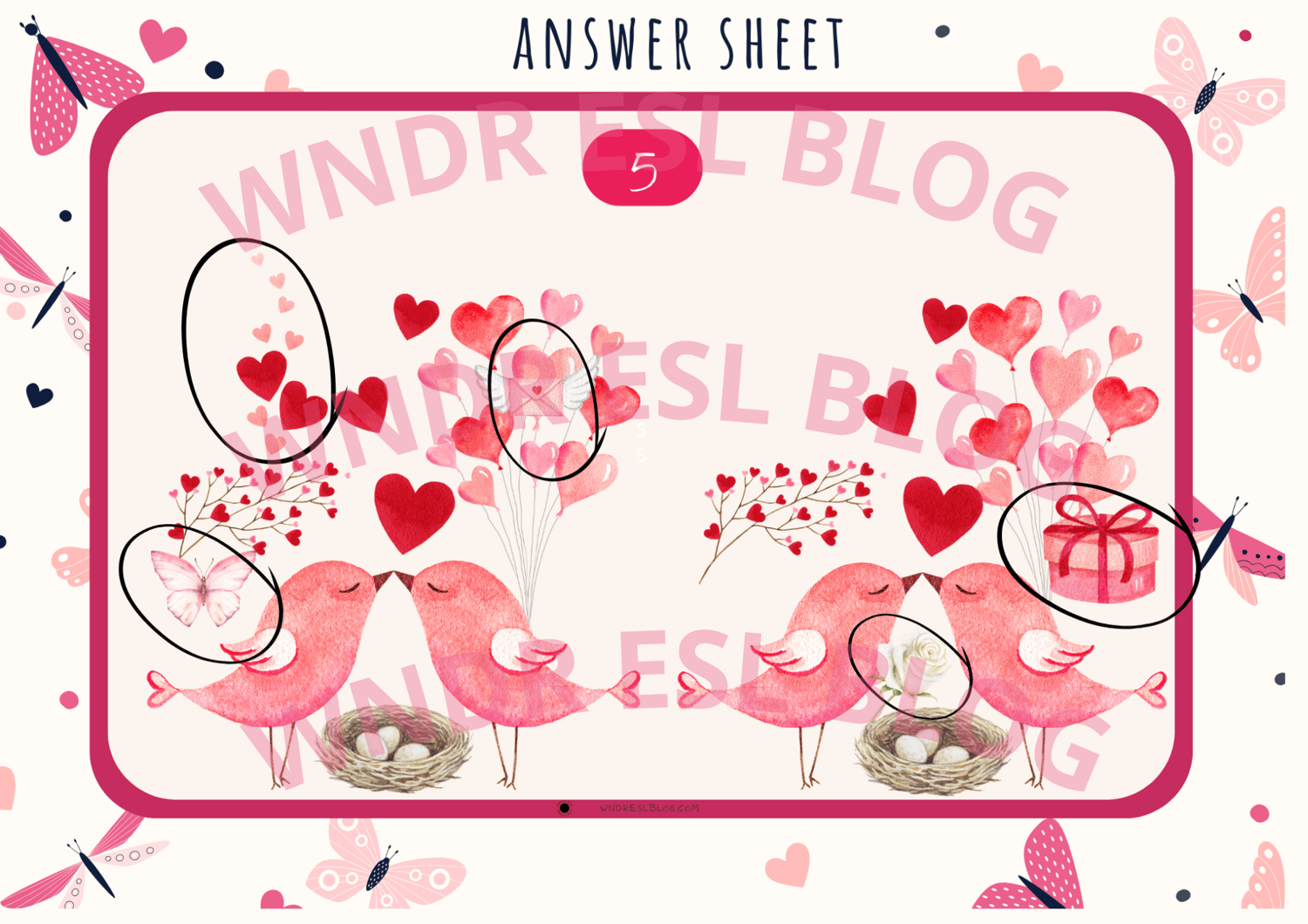 There are 18 awesome Valentine's Day I Spot the Differences cards + 18 answer sheets go one per page Us letter size.