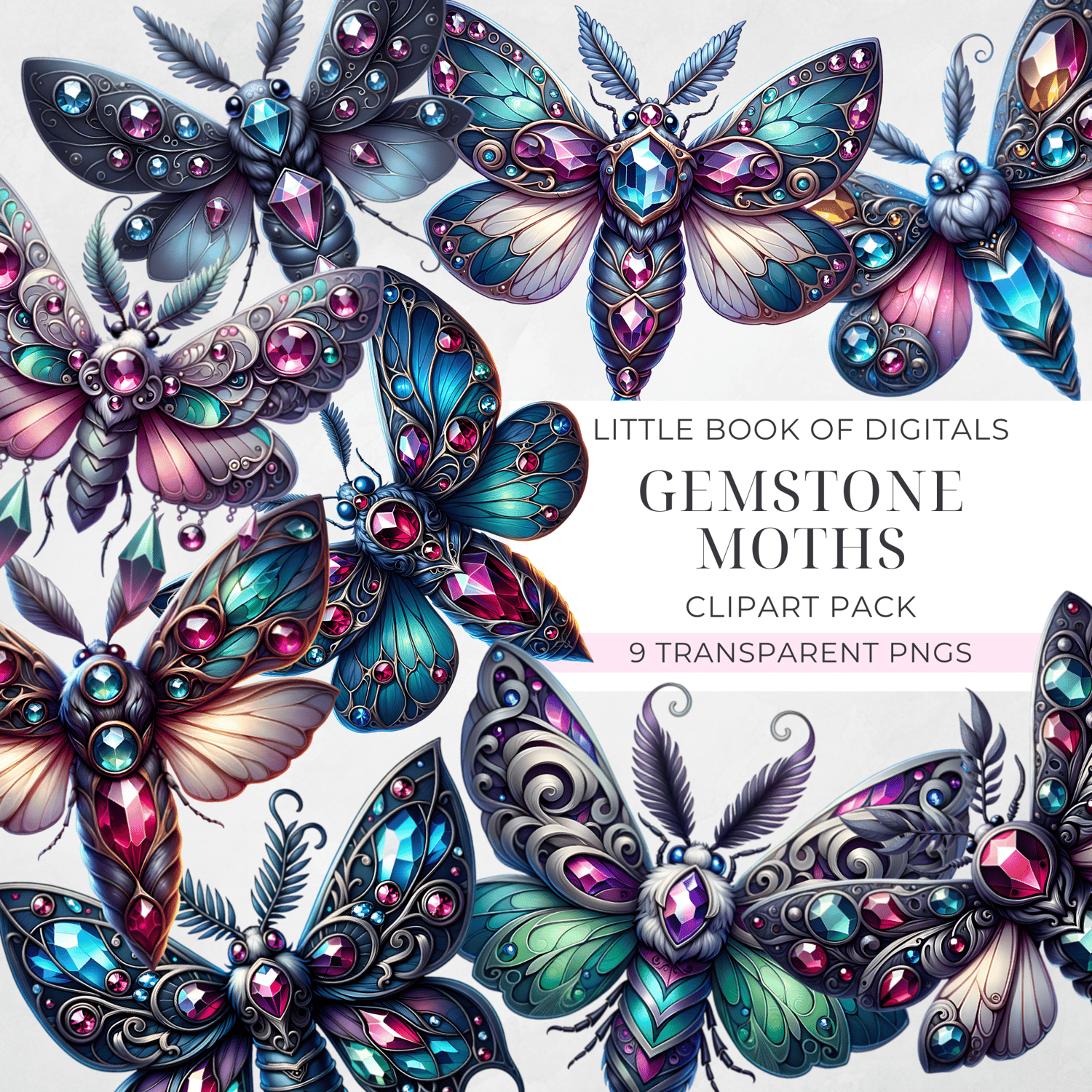 Gemstone Moths (Set Of 9 Clipart)