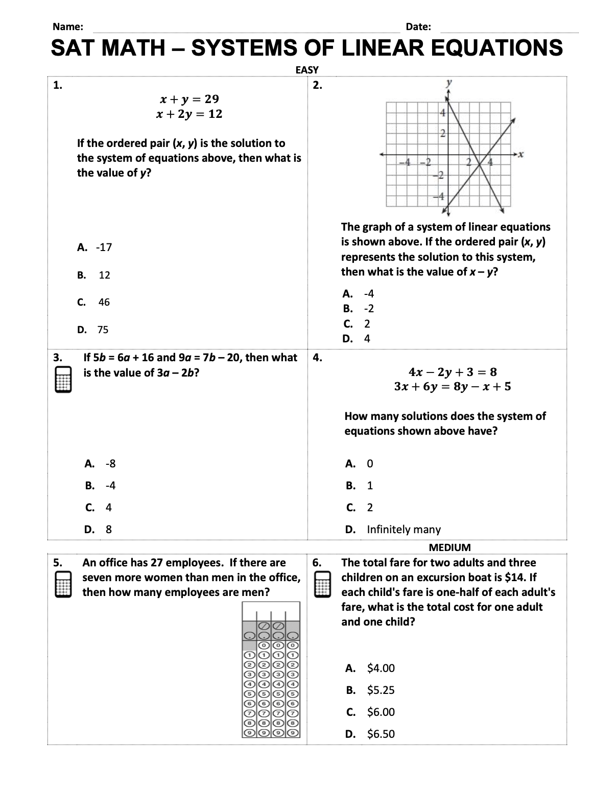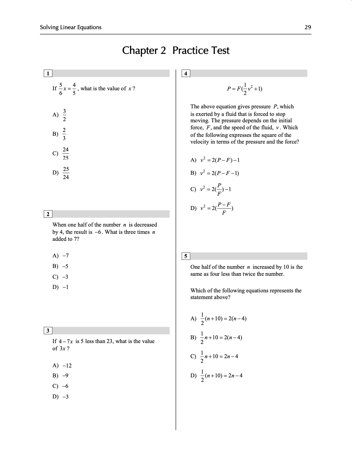 - Heart of Algebra: Linear equations, inequalities, systems of equations, and more.