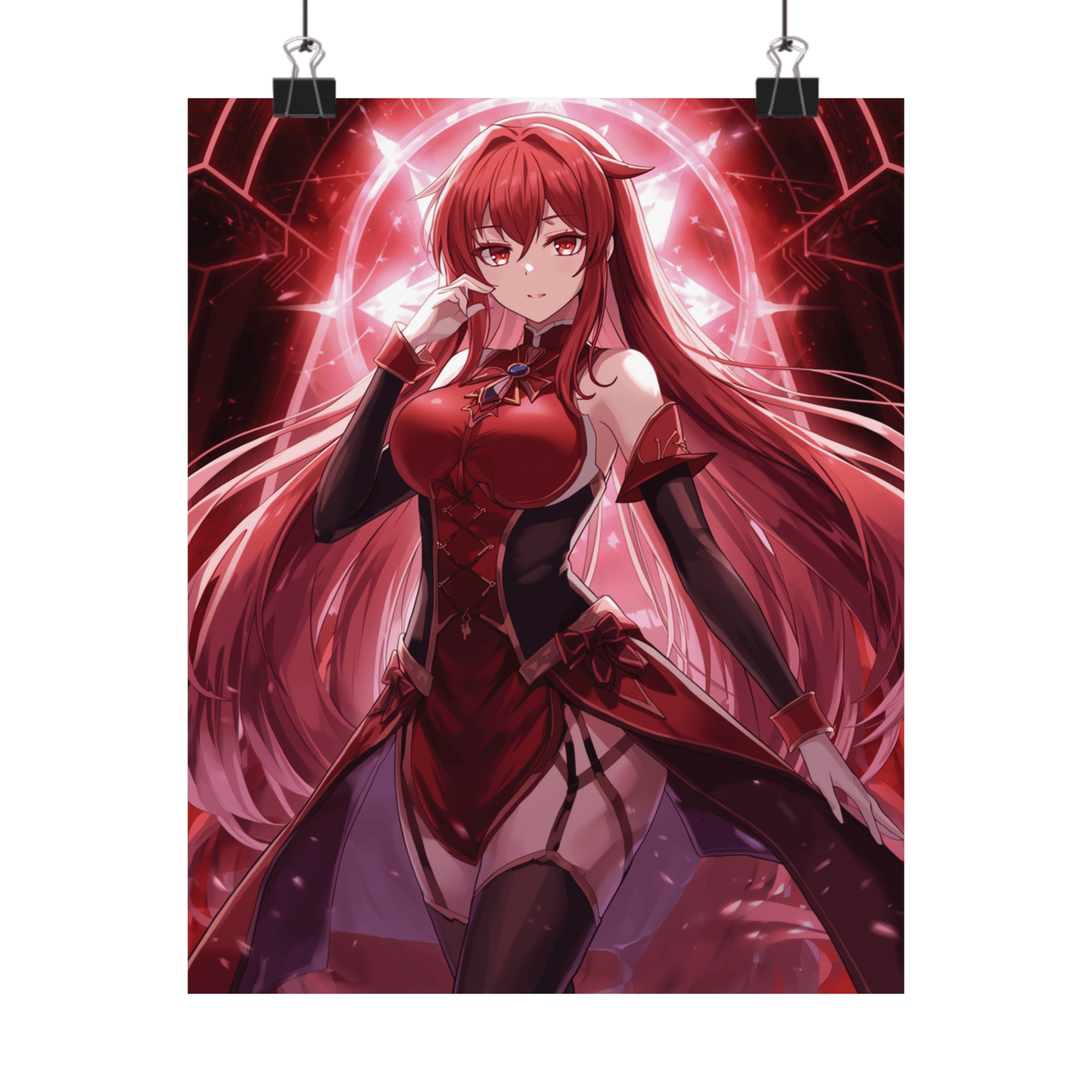 Elegant and confident pose, flowing long hair, and a vibrant red-and-black costume make this poster a must-have for anime fans. Dramatic lighting and mystical energy effects create a captivating centerpiece for any room.