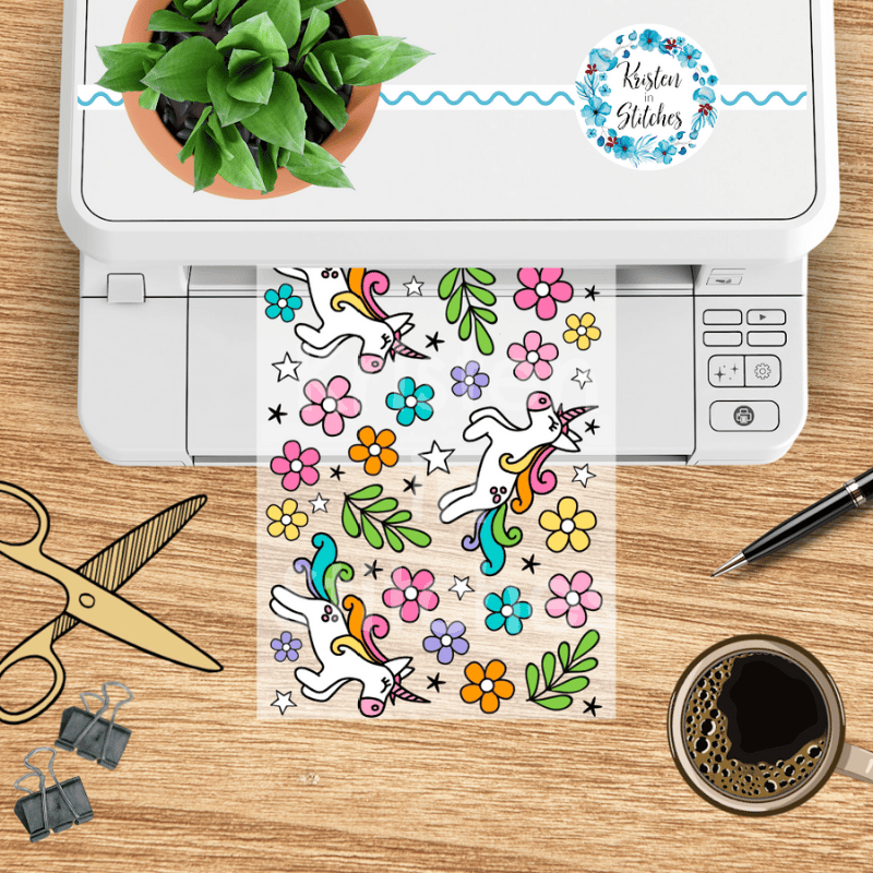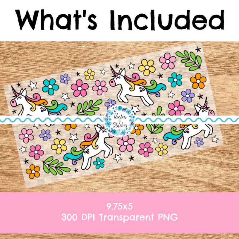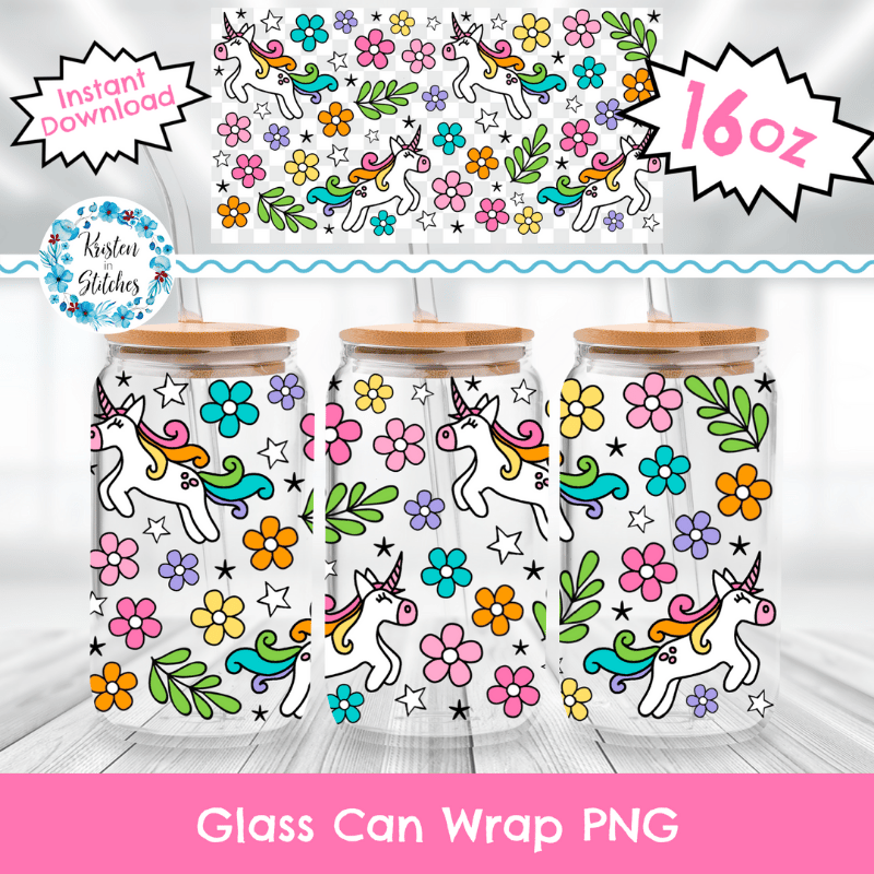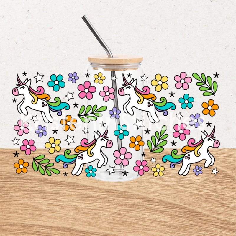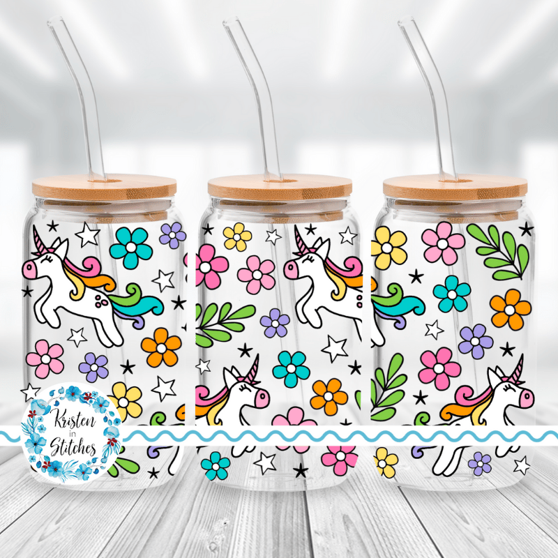 Rainbow Unicorns and Flowers Glass Can Wrap Transparent Cup PNG