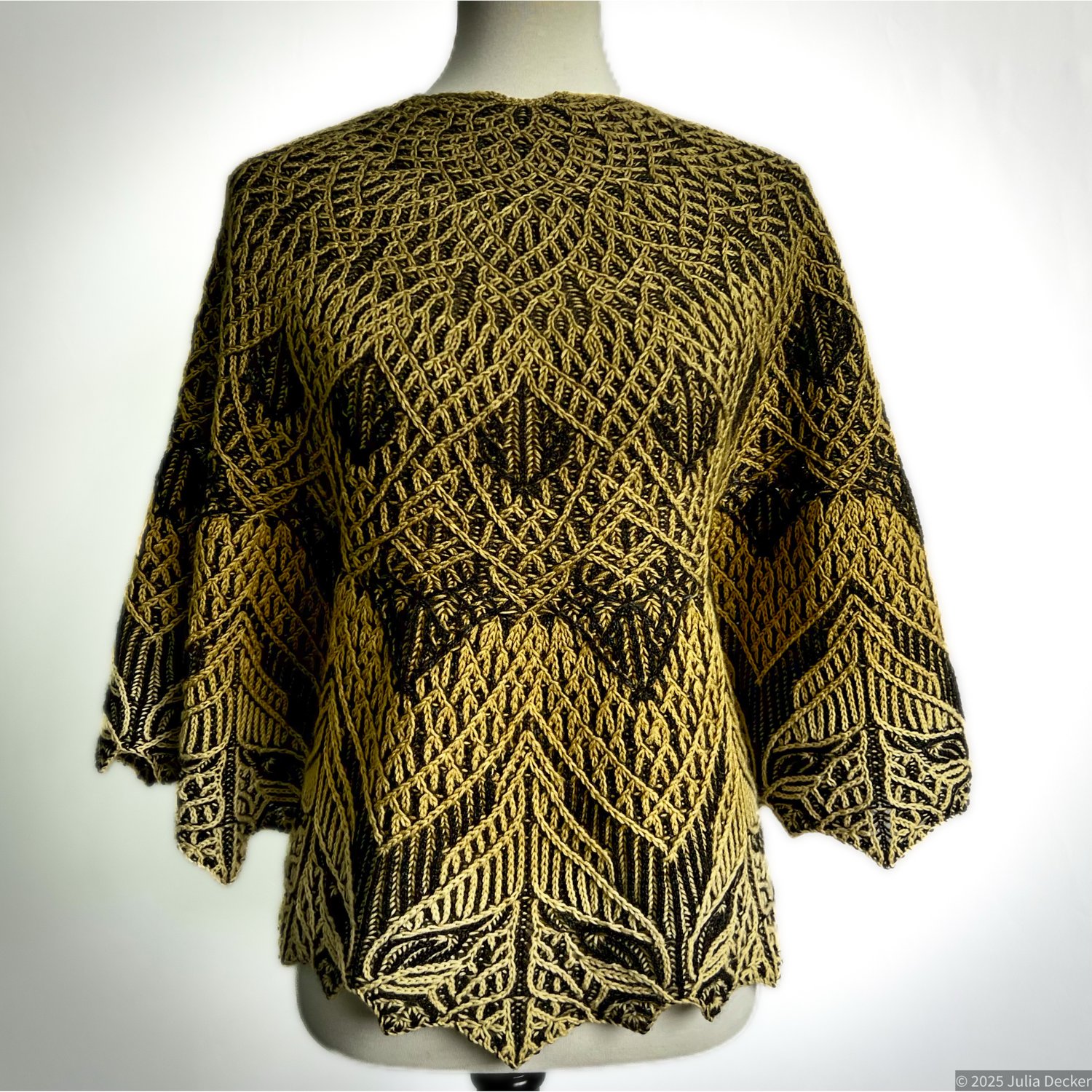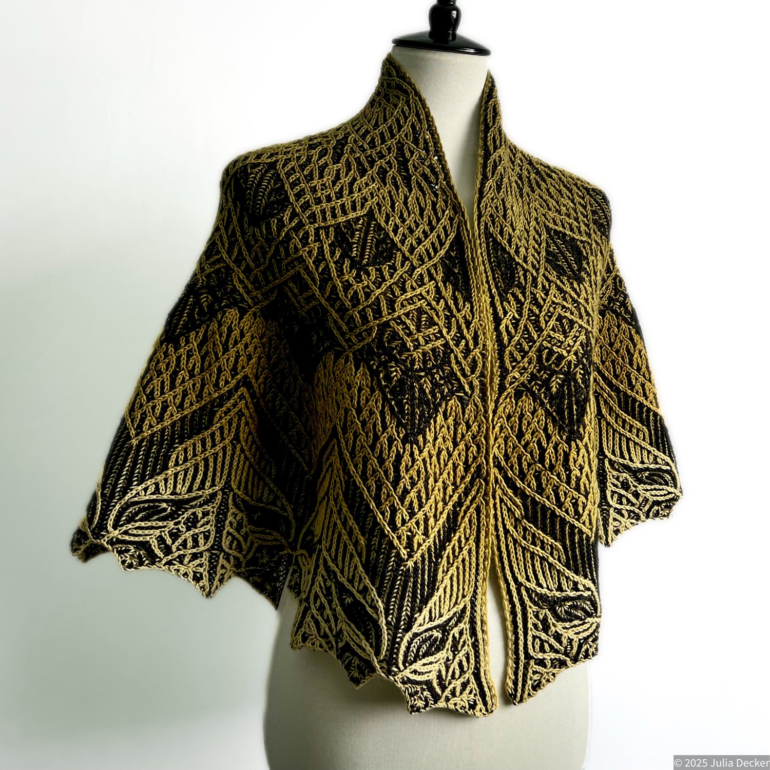 This shawl is recommended for those who already have some experience with two-color brioche. This is a challenging, intricate knit that incorporates a number of advanced techniques. A combination of brioche lace, brioche star stitches, brioche cables, and brioche syncopation are used to create this beautiful original design.