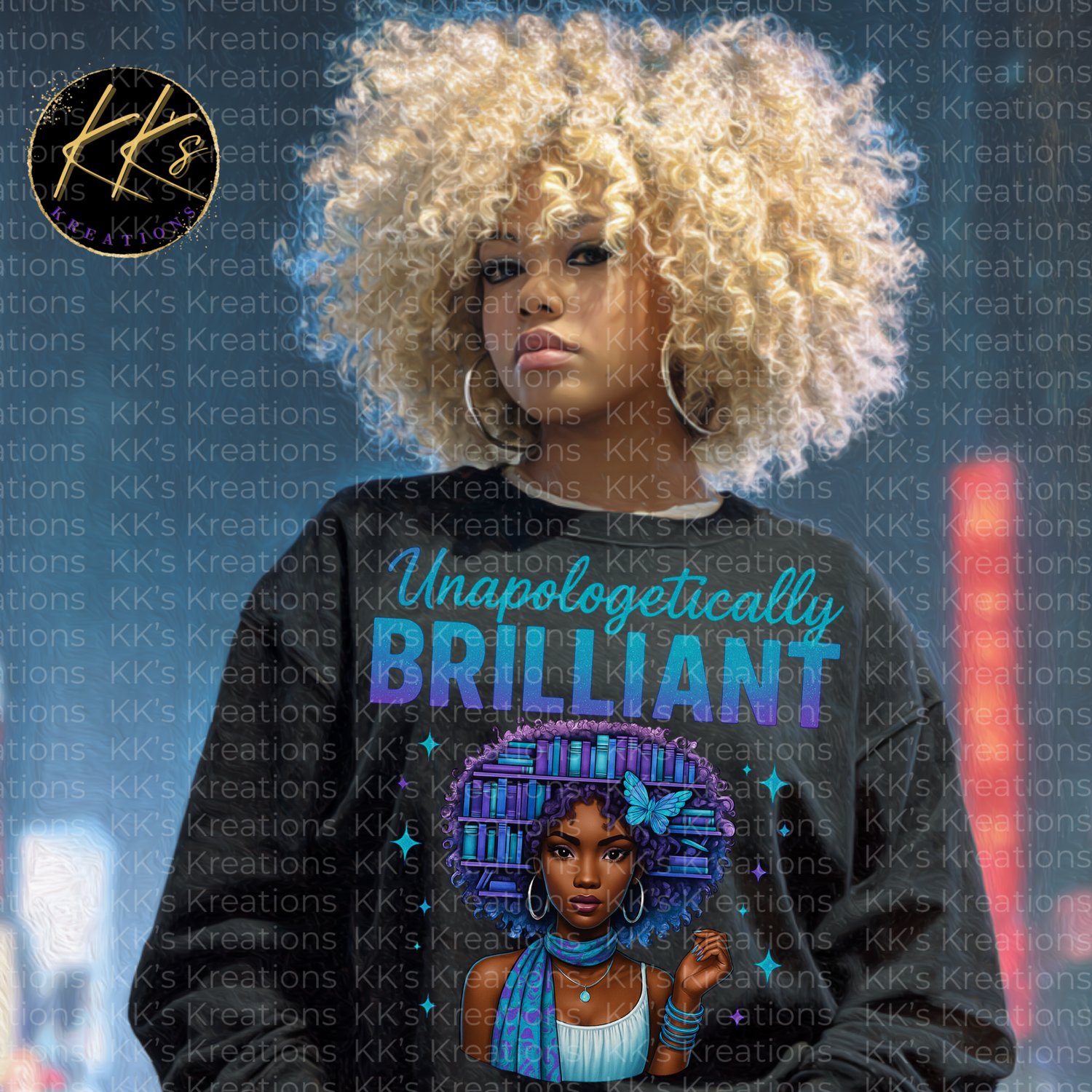 Bring bold energy and confidence to your next project with this Unapologetically Brilliant print from KK’s Kreationz. This high-resolution artwork features a stunning, richly detailed illustration of a beautiful Black woman crowned with books — symbolizing intelligence, creativity, and unapologetic excellence. The vibrant blend of purples, teals, and blues makes this the perfect statement piece for apparel and accessories.