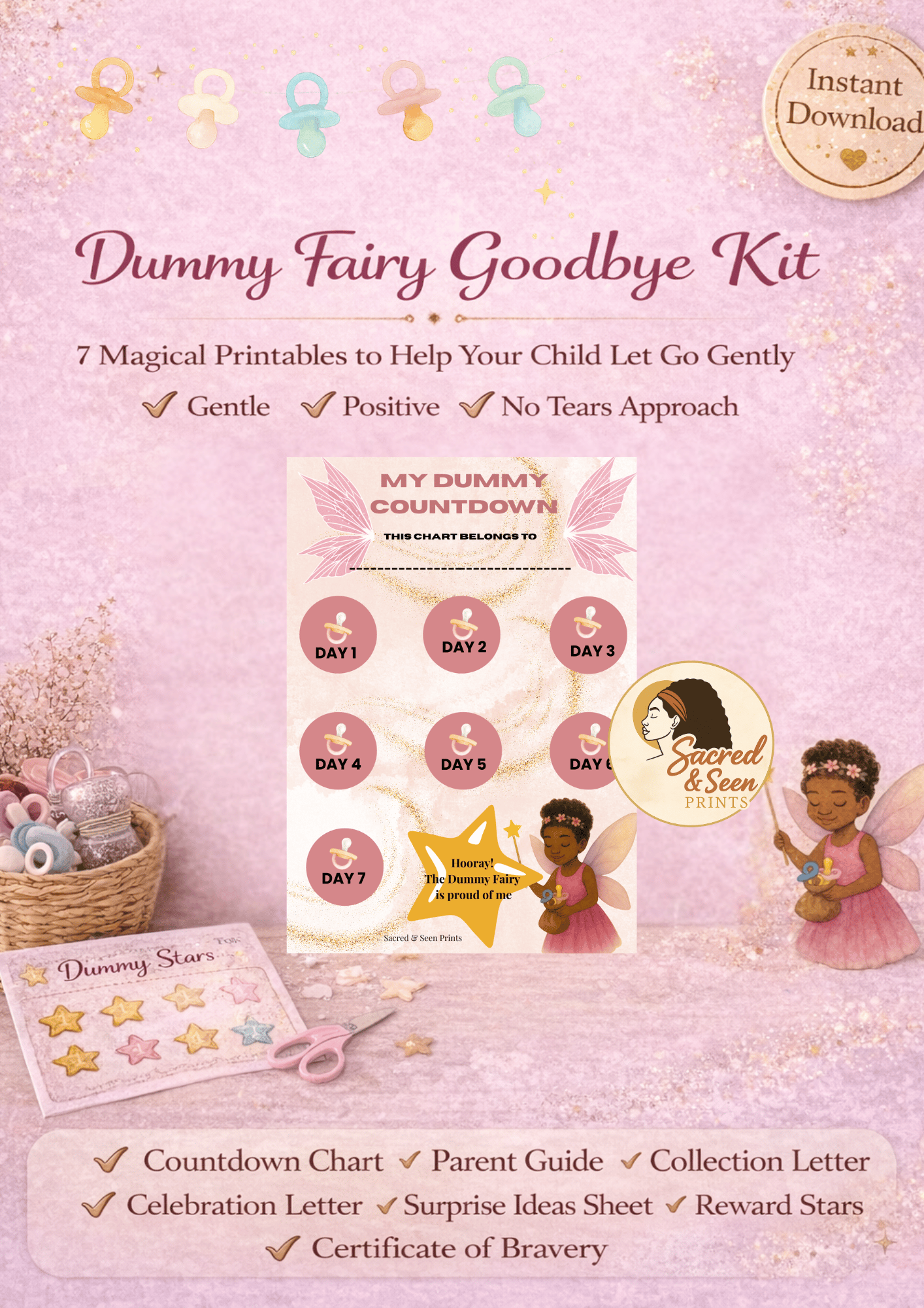 I created the Dummy Fairy Goodbye Kit for my own daughter when it was time for her to say goodbye to her dummies. I wanted her to experience this milestone in a way that felt gentle, magical and full of pride and to see a fairy that looked like her: brave, beautiful and truly seen.