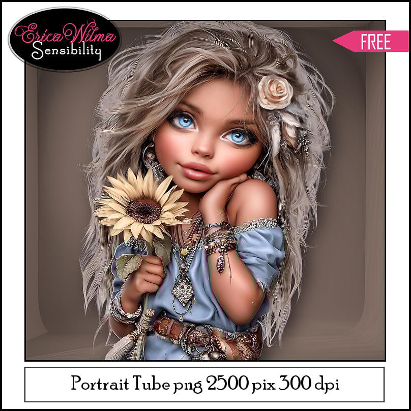 This beautifully detailed portrait tube features a charming boho-inspired girl with expressive blue eyes, soft flowing hair, and delicate accessories. She gently holds a sunflower, adding a warm, natural touch to the composition. The soft color palette and intricate details make this design perfect for a wide range of creative projects.