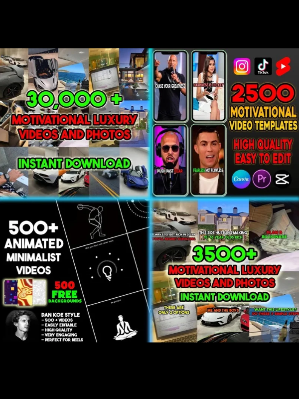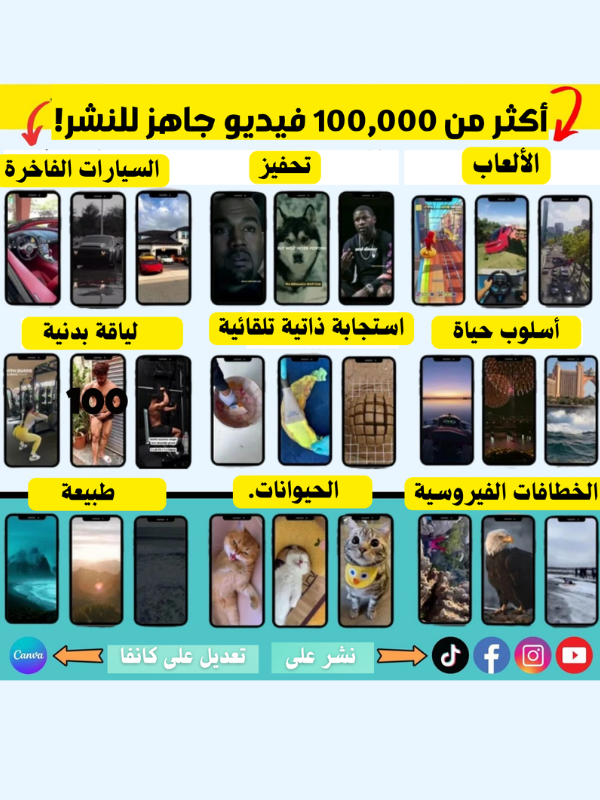 ج: أكثر من 100,000 فيديو MP4 عالي الجودة + قوالب Canva، مرتبة حسب التخصص وجاهزة للاستخدام.