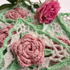 The 3 dimensional roses can be given a bolder feel by making them in different colours. The delicate crochet lace triangles work up really quickly too.