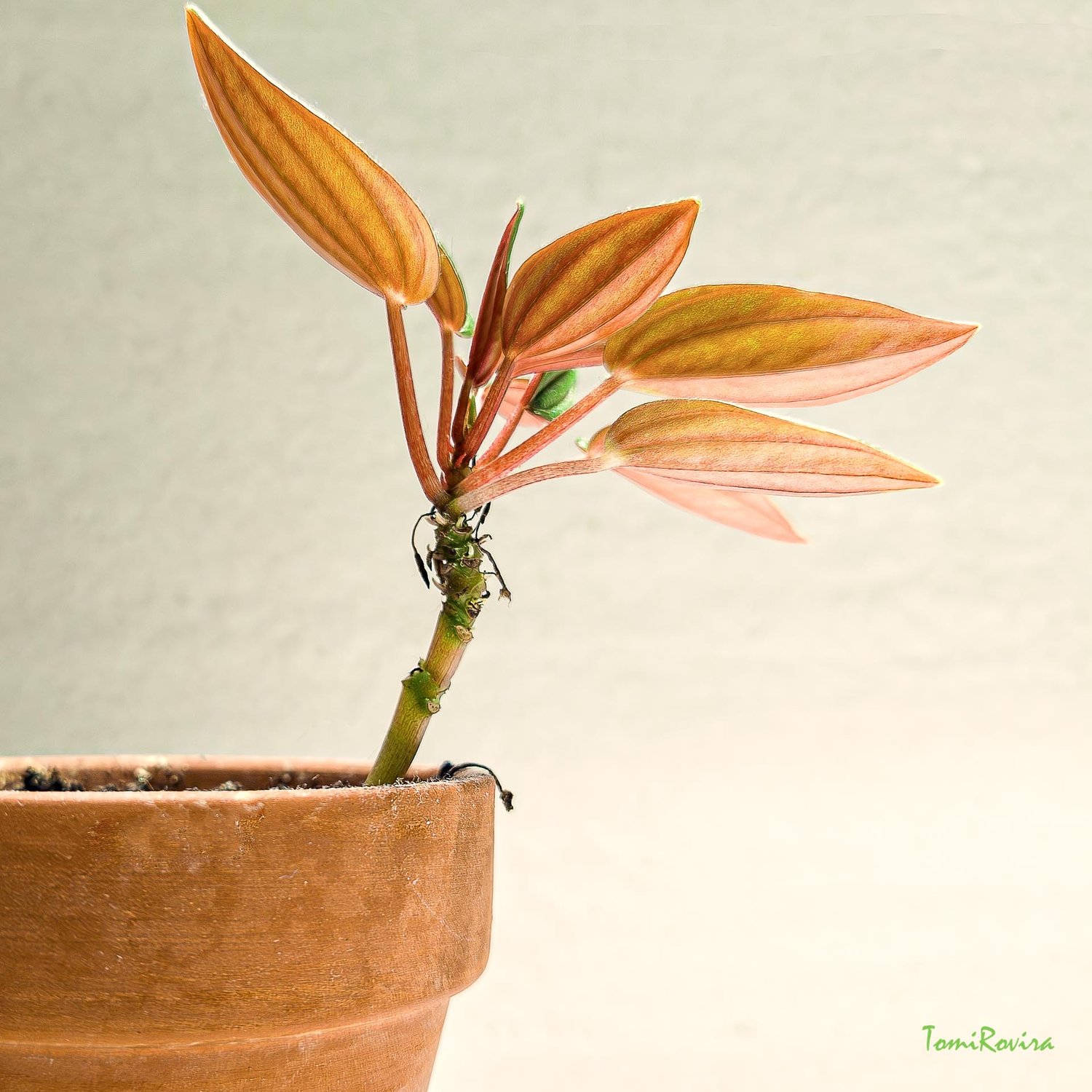 The neutral background gives all the prominence to this plant gesture: a captured moment of growth, fragile and brave at the same time, as if the plant were rehearsing its first step towards the light.