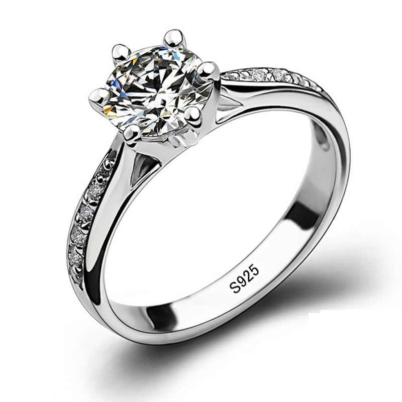 Luxury 925 Sterling Silver Classic Six Claw Ring for Women Imitation Diamond
