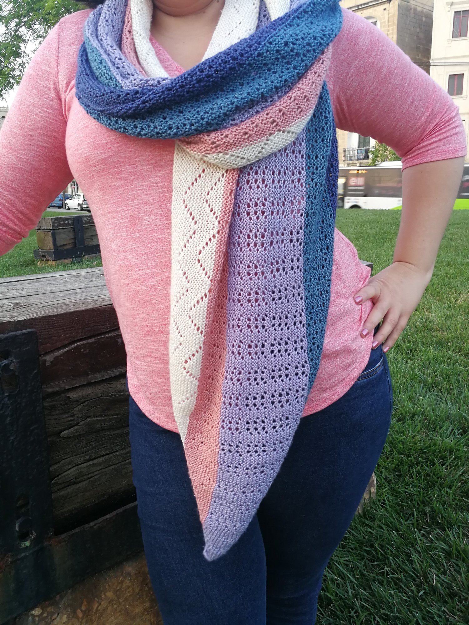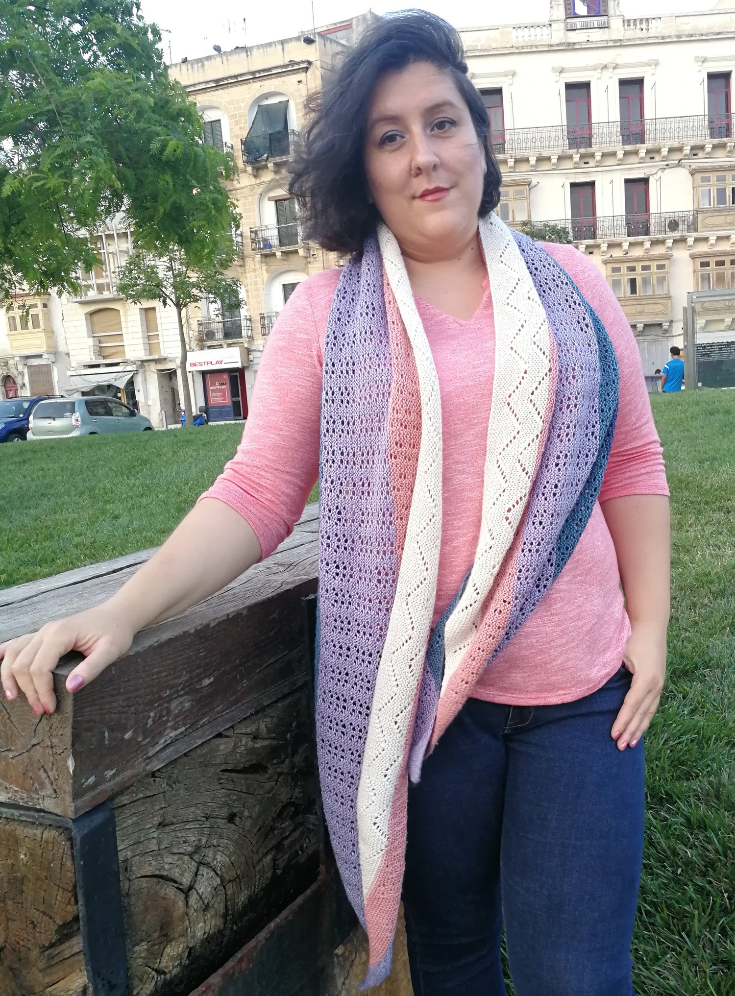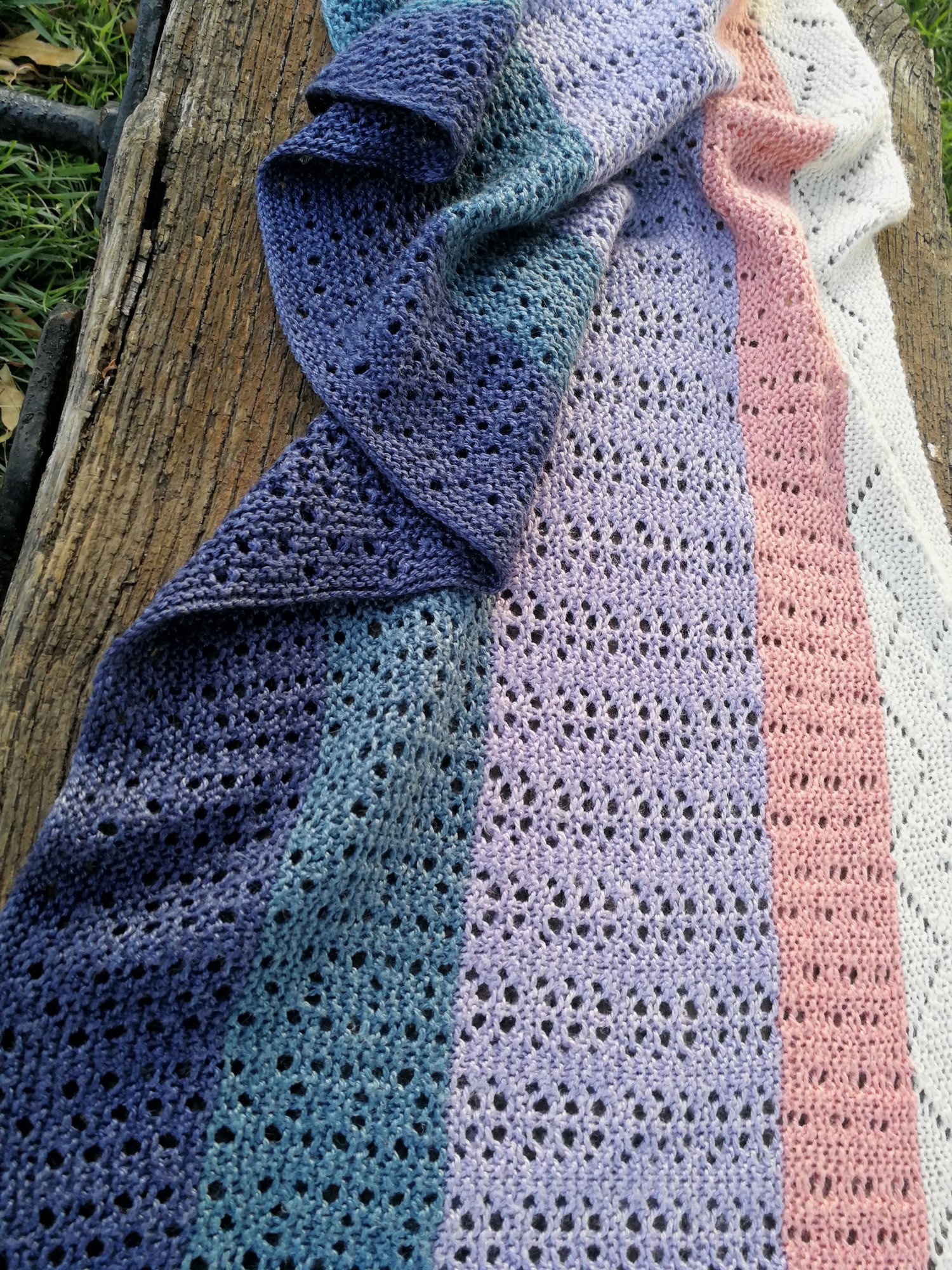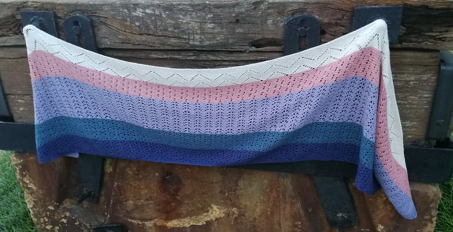 You will cast on a large amount of stitches, working down from the top, steadily increasing at each end whilst working various 14 Stitch repeat lace patterns and colour blocks, until reaching a set amount of stitches and then increase down again to the initial cast on amount. So as you’ll be working end to end horizontally, top down, rather then end to end over the longest length of the wrap, the rows will be of a large stitch amount but it doesn’t take that long to reach the bottom bind off. You can knit it in 5 block colours as I have, or a single colour or any combination you like.