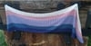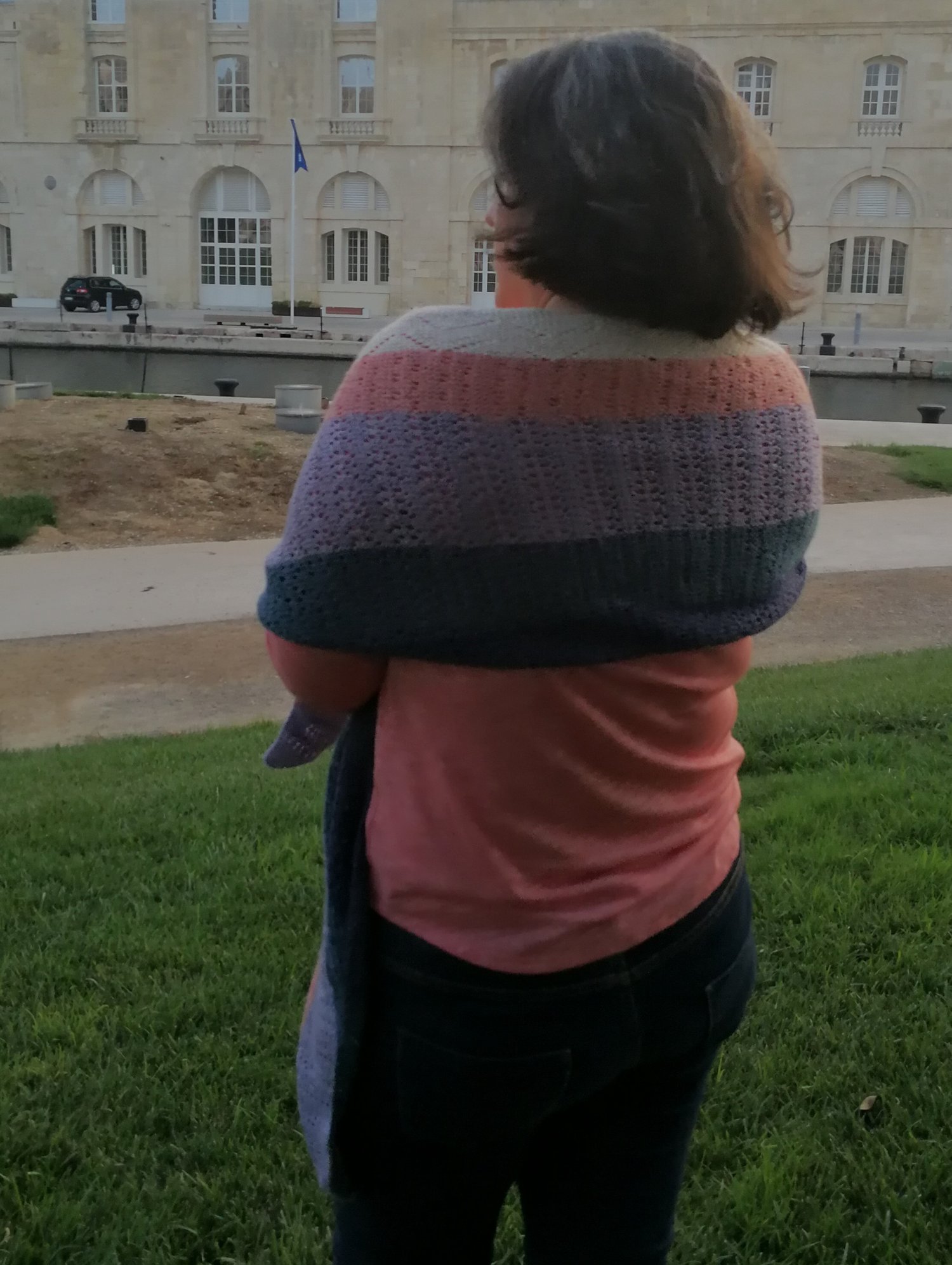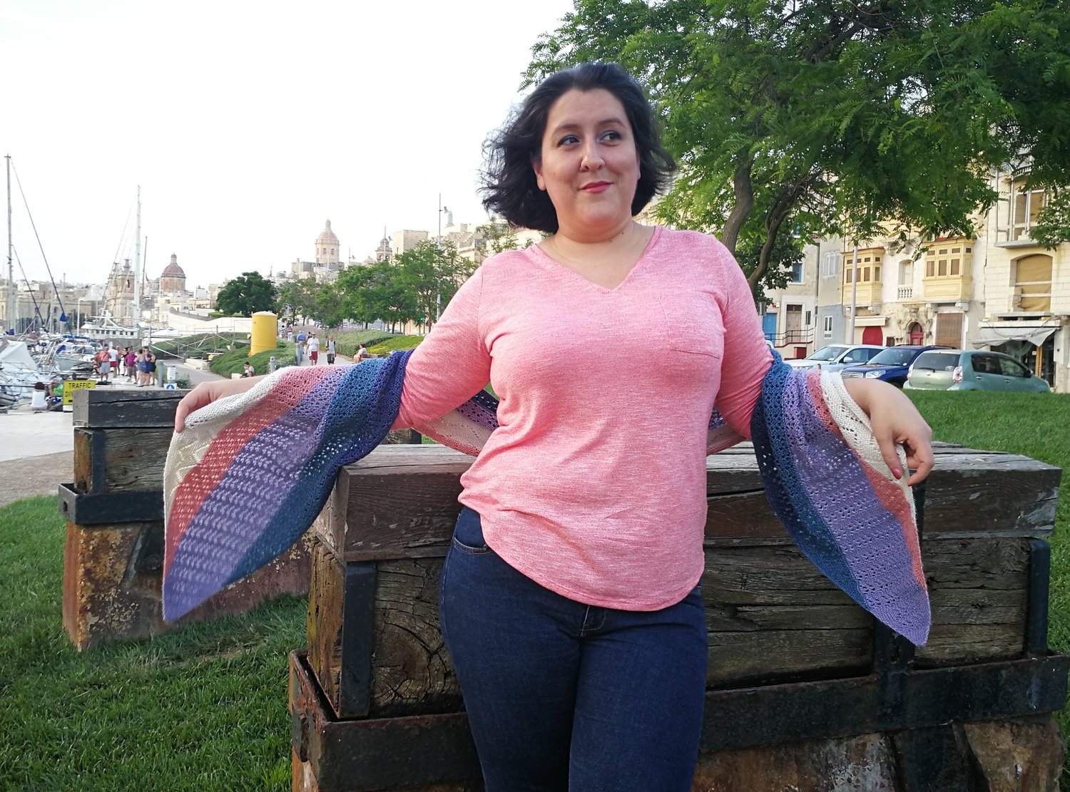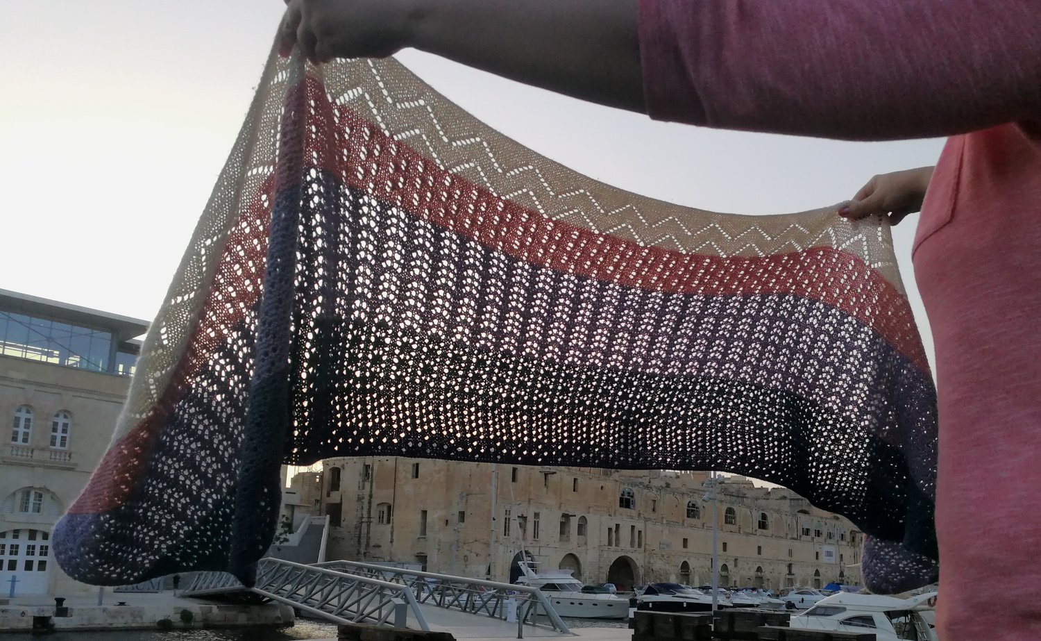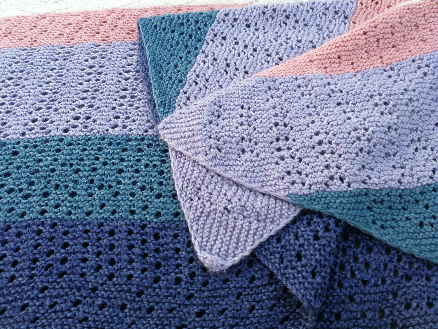 You will cast on a large amount of stitches, working down from the top, steadily increasing at each end whilst working various 14 Stitch repeat lace patterns and colour blocks, until reaching a set amount of stitches and then increase down again to the initial cast on amount. So as you’ll be working end to end horizontally, top down, rather then end to end over the longest length of the wrap, the rows will be of a large stitch amount but it doesn’t take that long to reach the bottom bind off. You can knit it in 5 block colours as I have, or a single colour or any combination you like.