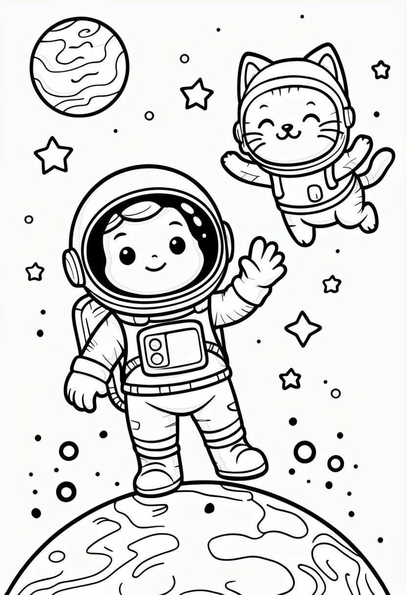 - Explore the cosmos with a cute astronaut floating among stars and planets. This page is designed with bold outlines and fun details that invite you to color the wonders of space.