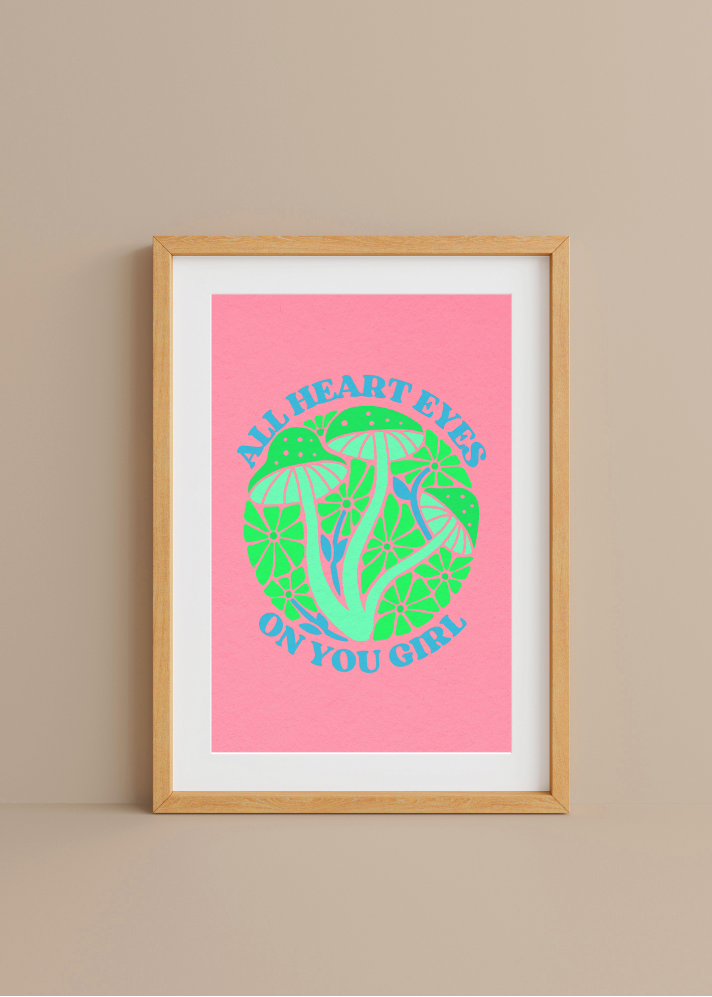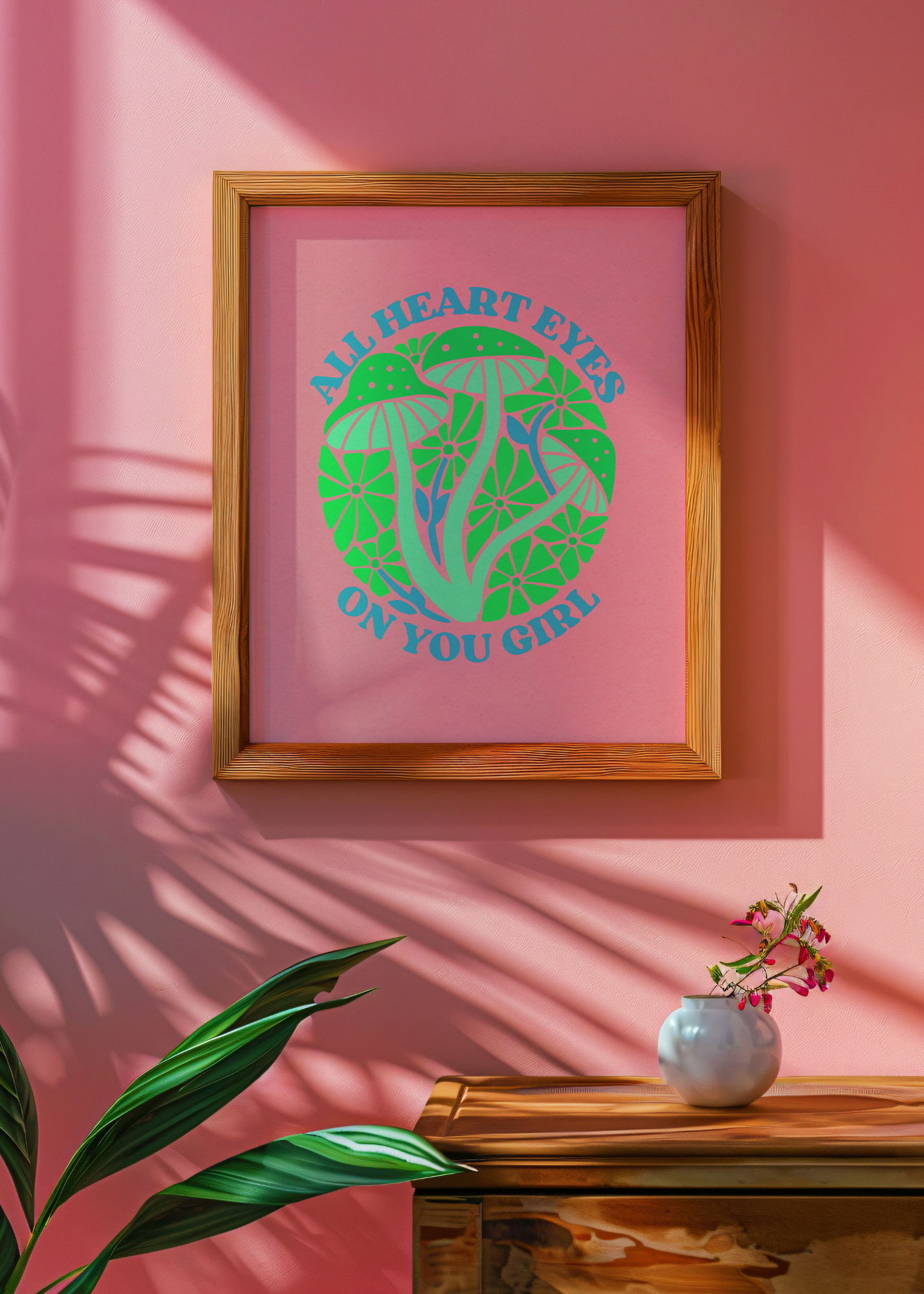 All Heart Eyes on You— This one’s got sass, spark, and a whole lot of heart. With bold contrast and a juicy pink backdrop, the aqua-toned mushrooms and teal blossoms practically dance off the page. It’s like a pep talk and a dance party rolled into one—perfect for spaces that thrive on bold color and brighter moods.