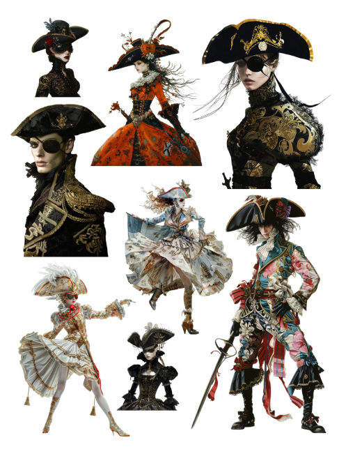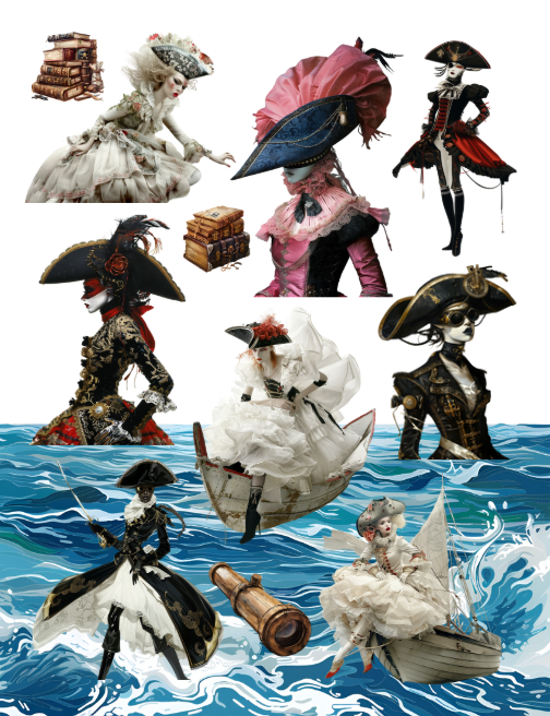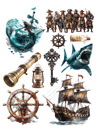 Pull out your scissors and glue and dive into the world of pirates and their fun journeys featuring pirate ships, port holes, cute pirate elephants, pirate fairies, treasure maps, telescopes, anchors, messages in a bottle, scary and handsome pirates, pirate animals including dogs, people both real and cartoon figures suited for adult and child images, Halloween themed pirates, treasure chests, binoculars, parrots, sextons, octopi, spider, boots, gold, Christmas themed pirates, pirate flag and much more with this artistically beautiful clip art cut and collage book.