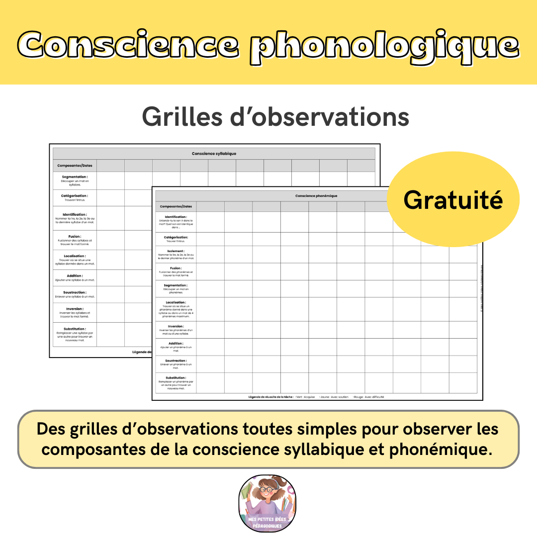 Vous trouverez diverses grilles pour observer les diverses composantes de la conscience syllabique et phonémique.