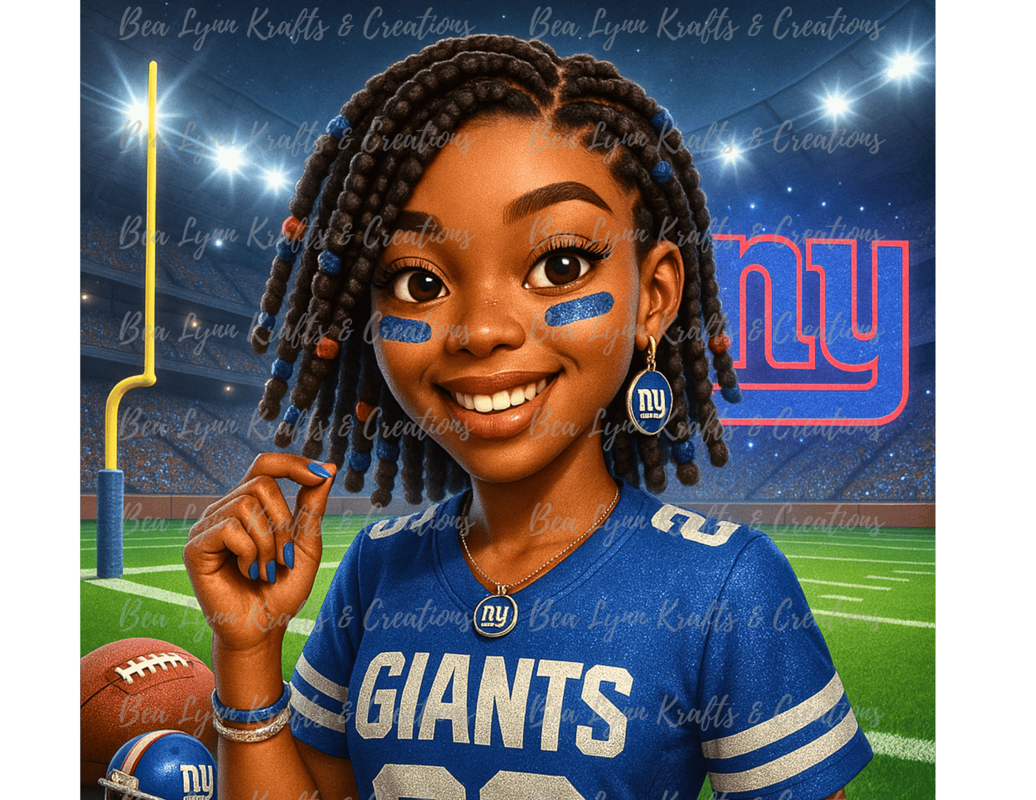 Bring the energy of MetLife Stadium to your designs with this adorable New York Giants cartoon PNG! Featuring a smiling young girl with braided hair decorated in team colors, bold blue face paint, a sparkling Giants jersey, and matching earrings and necklace, this image radiates true Big Blue pride. Perfect for football-themed merchandise, party decor, sublimation crafts, or DIY apparel—this digital file celebrates fan spirit with youthful charm and vibrant style.