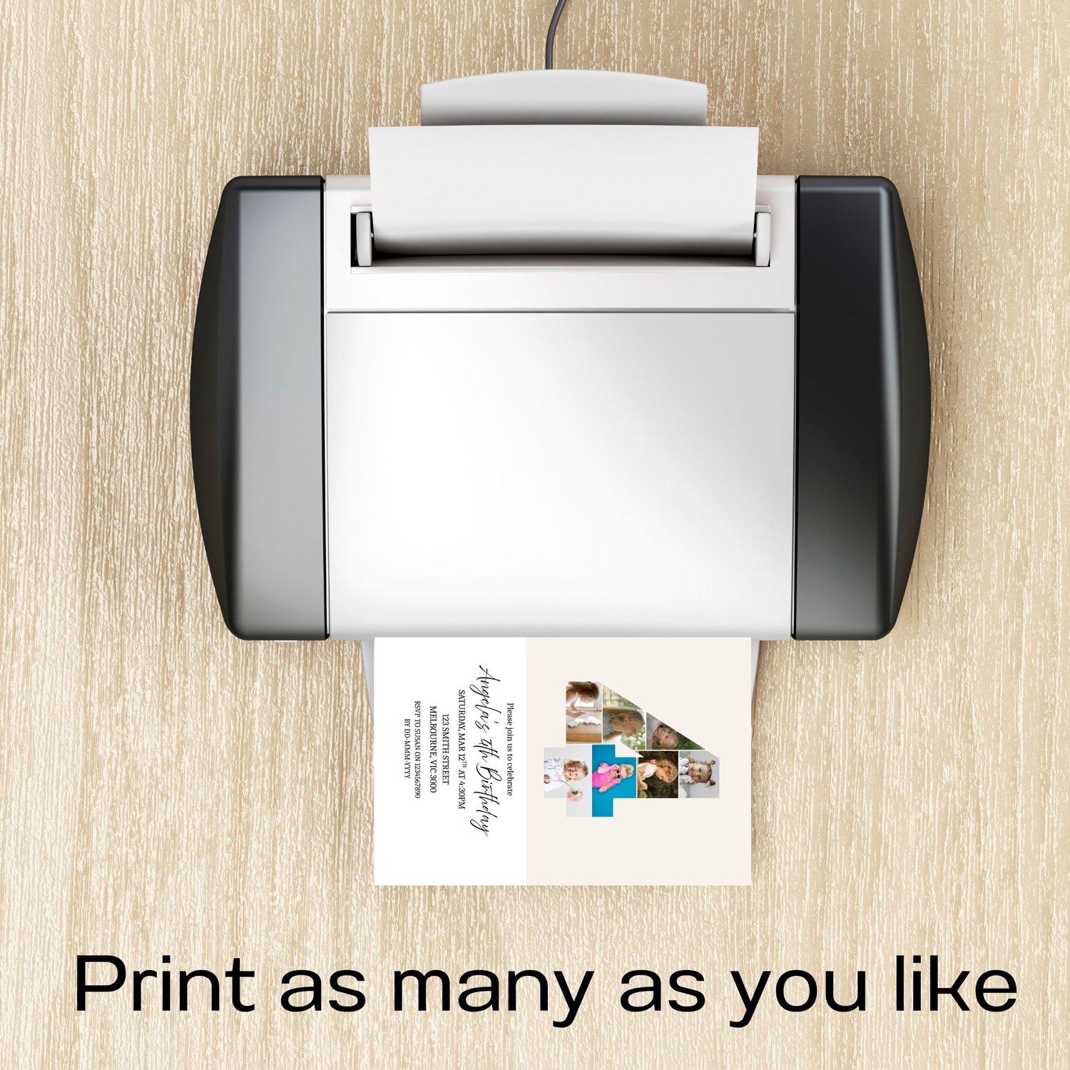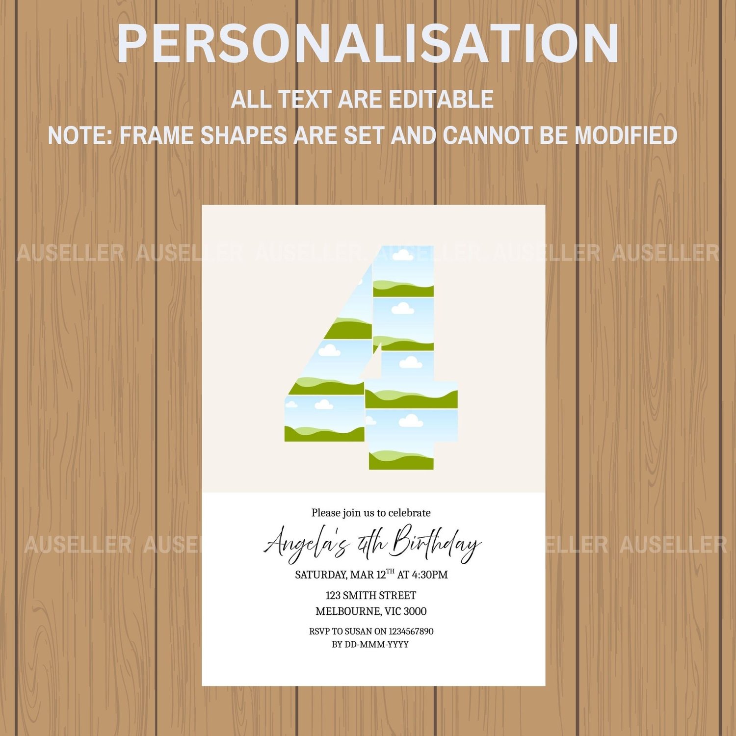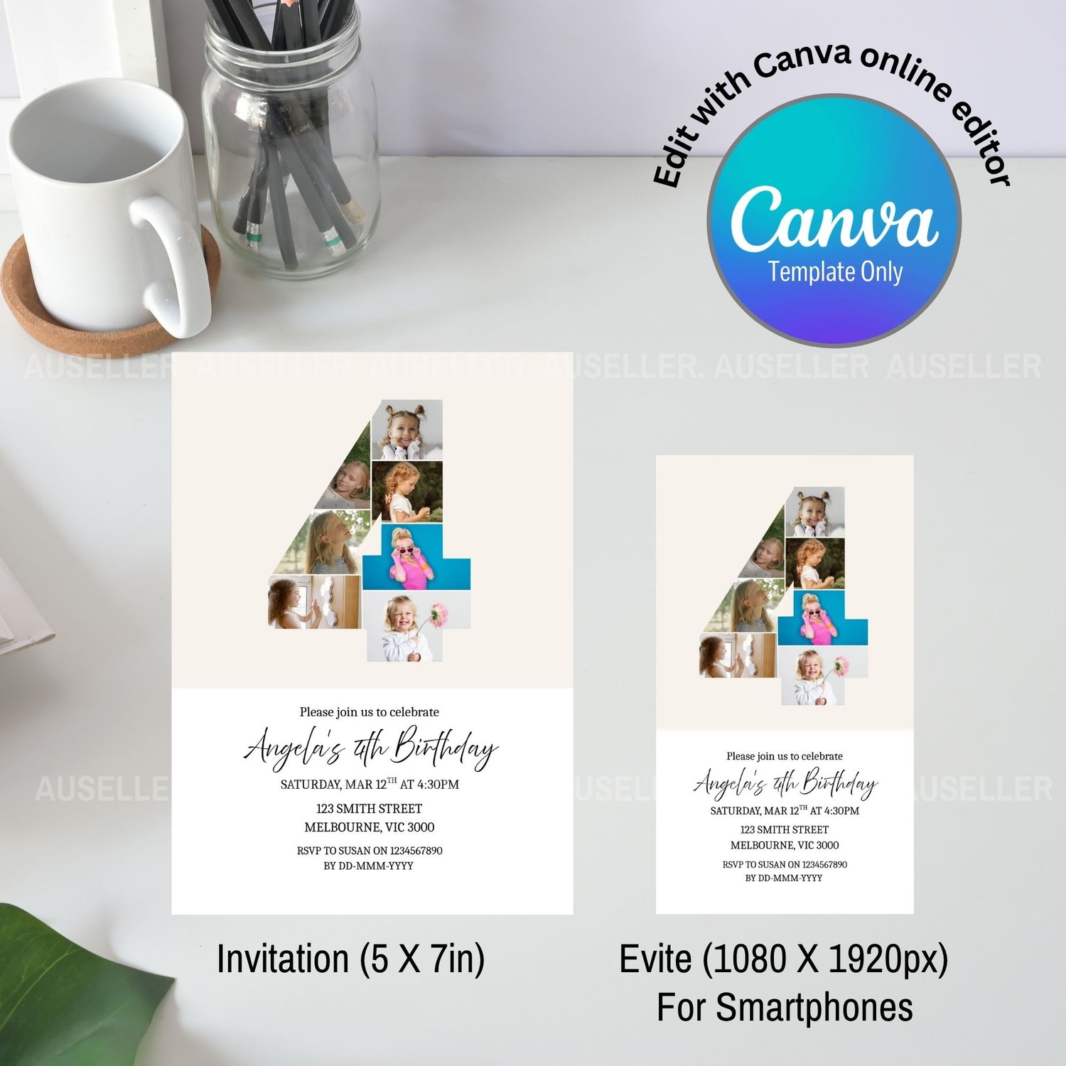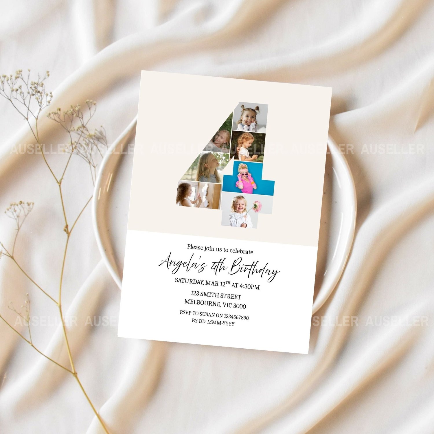 Celebrate your little one's biggest milestone with this beautifully designed editable 4th birthday invitation! Featuring a unique number '4' photo collage design, this invitation lets you showcase seven of your best images of your child creating a heartwarming and personal touch your guests will love. This minimalist design is the perfect invitation for boys or girls. Whether you're planning a cozy gathering or a big celebration, this invitation is a perfect way to kick off your child's 4th birthday in style. Easy to personalise and make your own!