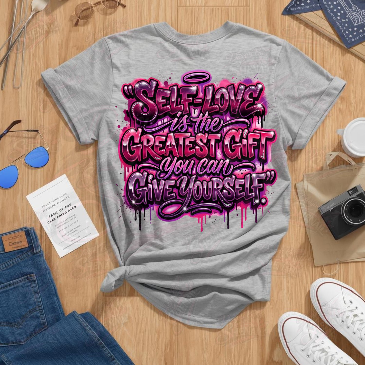 This bold and beautiful “Self Love is the Greatest Gift You Can Give Yourself” design is a powerful reminder to choose YOU every single time. Featuring vibrant pink and purple tones, graffiti-style lettering, and sparkling accents, this artwork blends affirmation with eye-catching style.