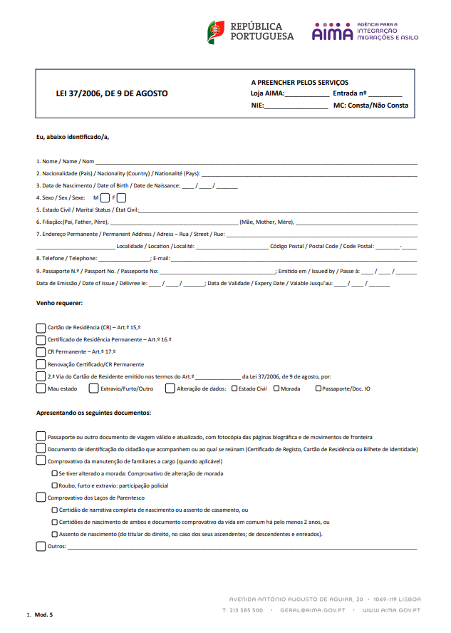 Modelo 5 - Cartão de Residência (Pedidos/Renovação/Alteração de Dados/2.ª Via) UE/EEE/Suíça e Familiares.