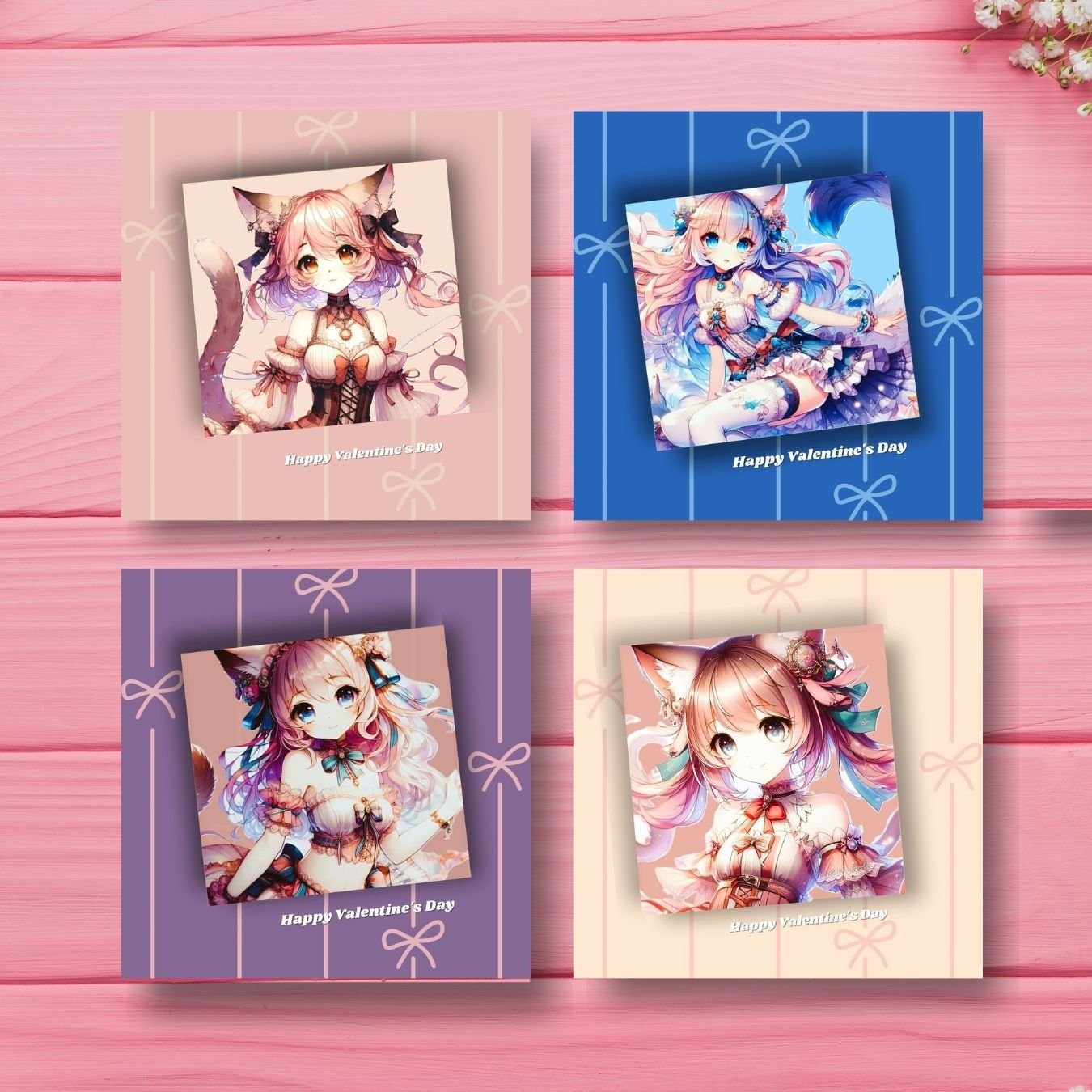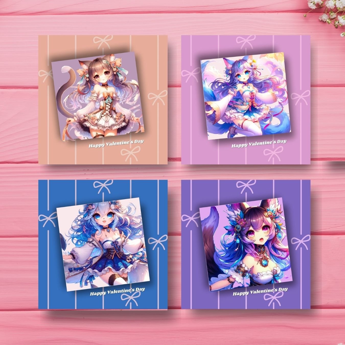 8 Valentine's Day Cards with Adorable Neko Girls, Neko Printable Valentine's Day Cards