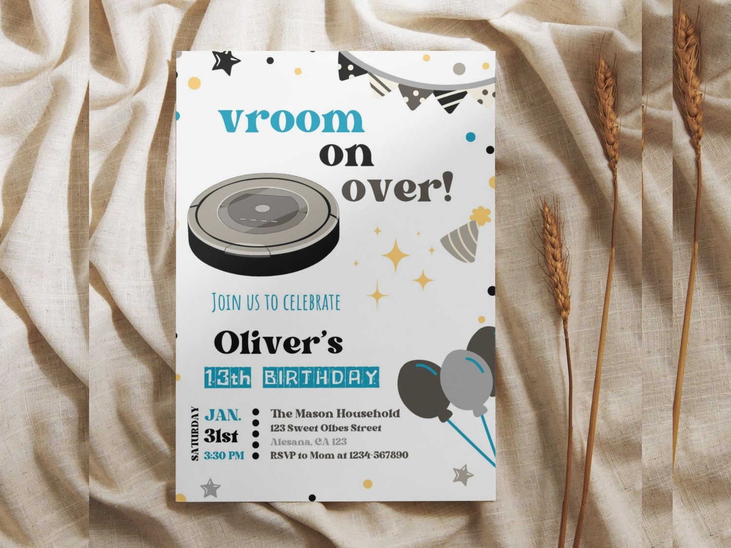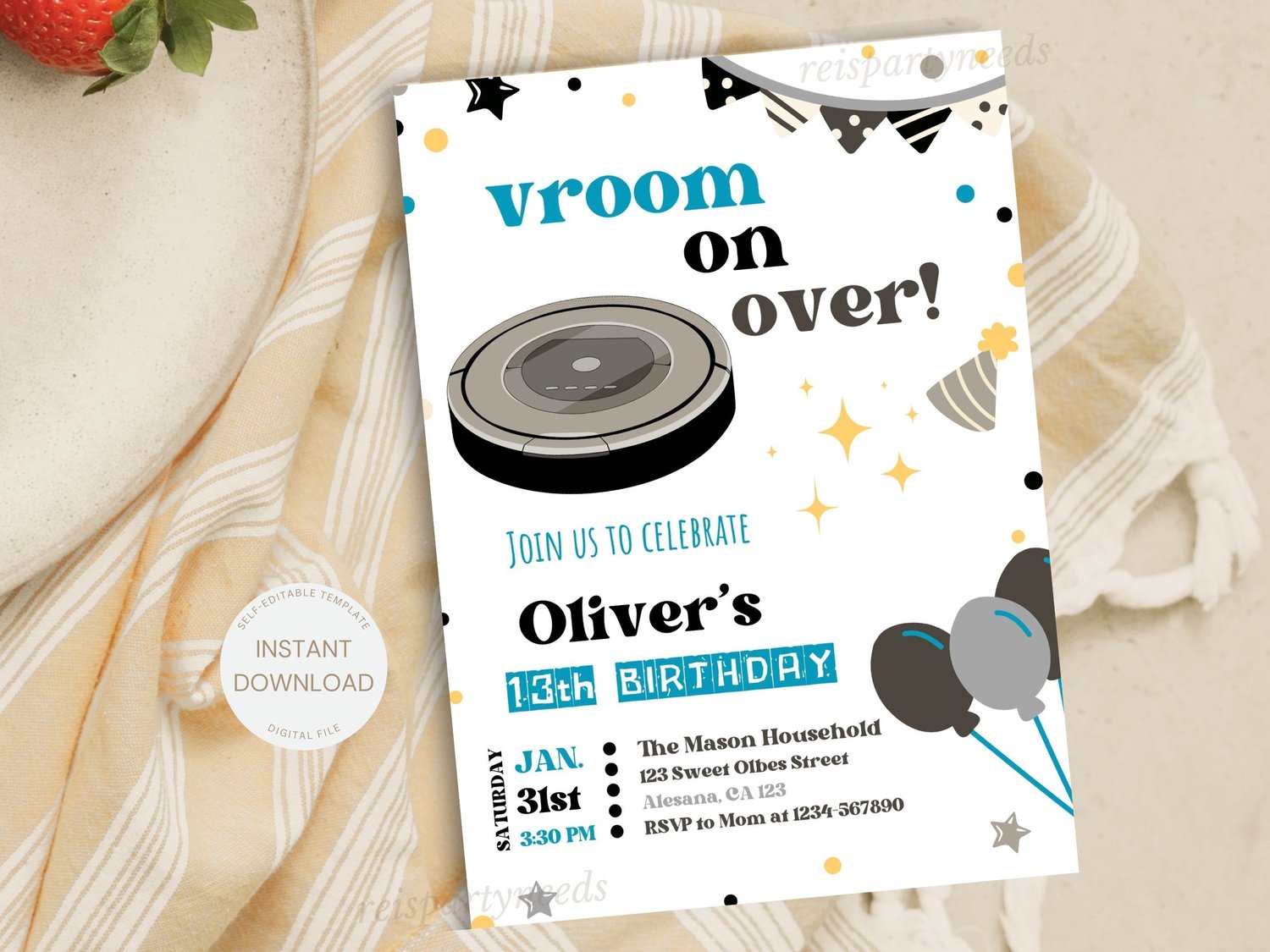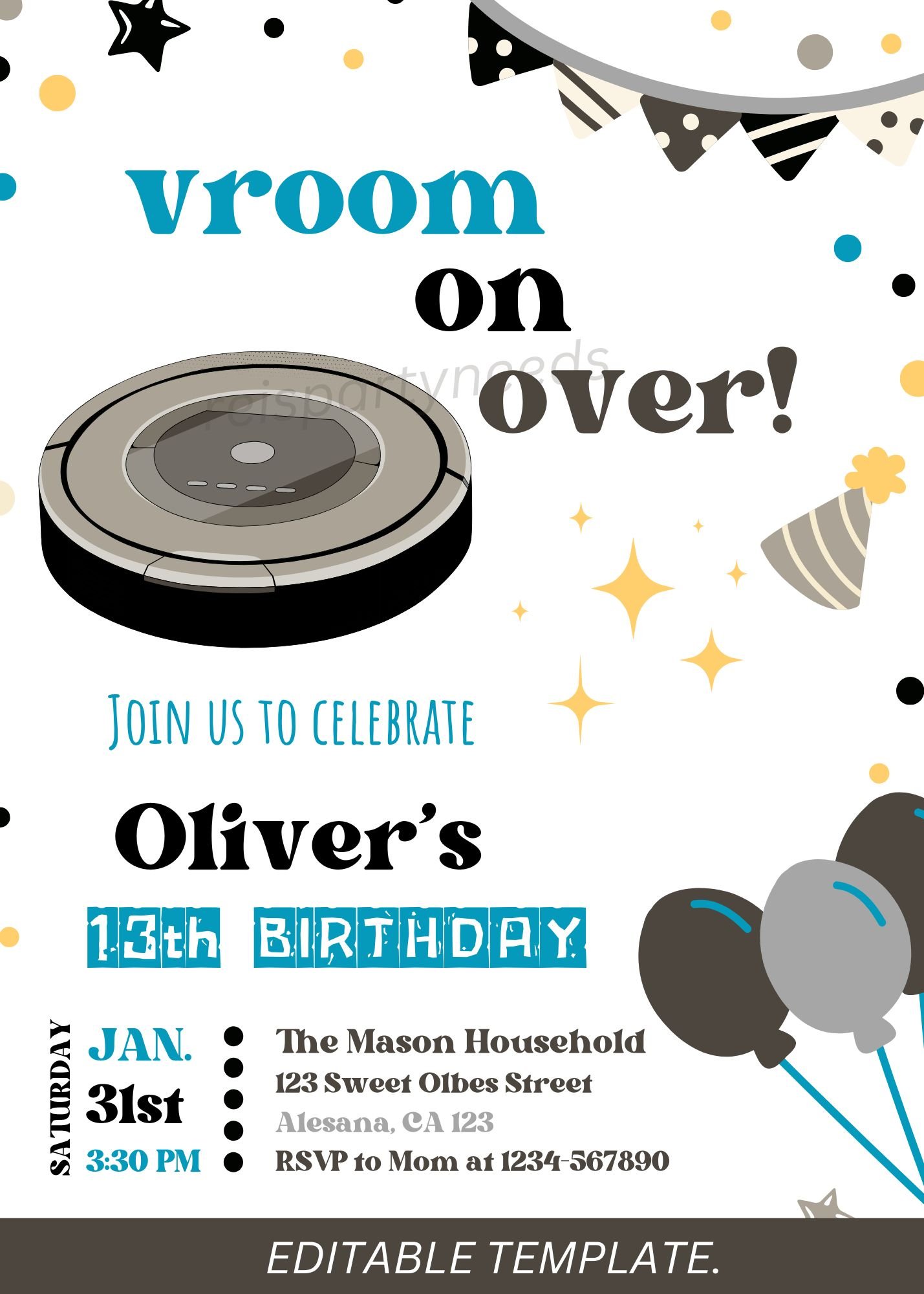 Editable Roomba Birthday Party Invitations, Vacuum Party Invitations, Cleaning Birthday Party Invite, Roomba vacuum Birthday Invitations