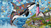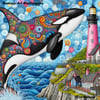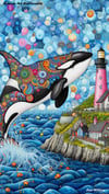 Beautiful big killer whale with spirograph patterns & spirograph waves. There are ships, a lighthouse & some cliff sea houses.