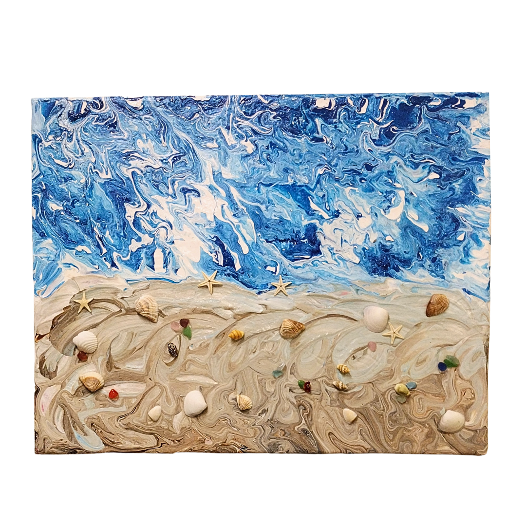 A mixed-media beach acrylic painting with natural seashells, starfish and plastic sand jewels. On a medium 11x14 canvas. Perfect for wall hanging.