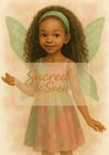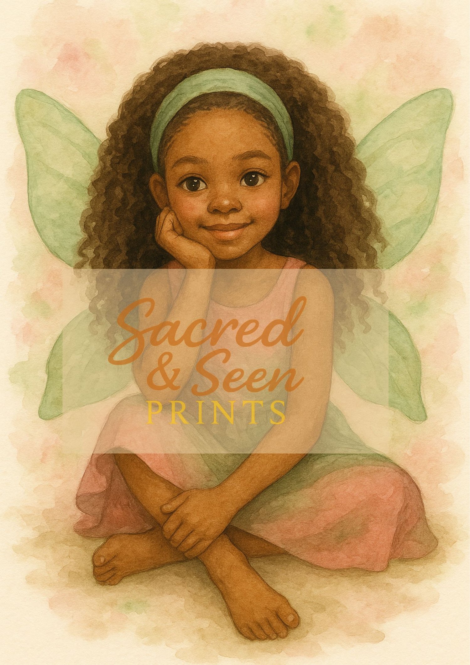 Each illustration features a sweet fairy with soft curls, delicate green wings, and a flowing pink-and-green dress, beautifully painted in gentle watercolour tones. Together, they create a calm, dreamy atmosphere, perfect for nurseries, children’s bedrooms, playrooms, or as heartfelt gifts.