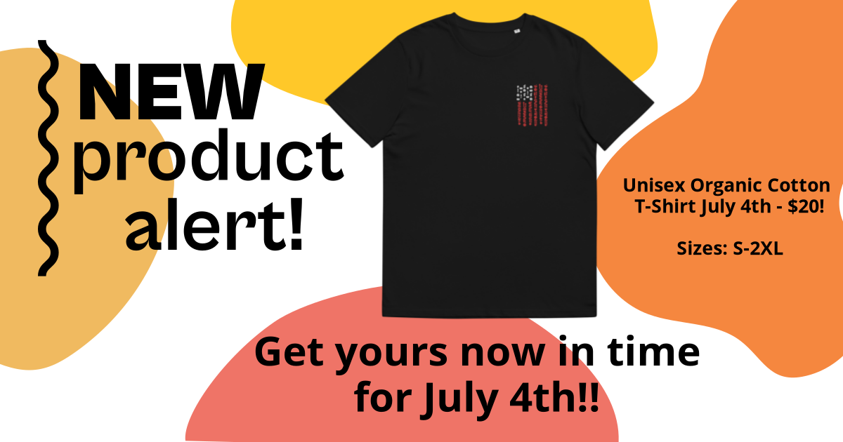 Just in time for Independence Day! Simple but elegant design of an American flag (made with a combination of fireworks, stars, USA etc…) embroidered onto the left chest portion of the shirt. Completely eco-friendly, light weight and a PERFECT way to show your American spirit this holiday!