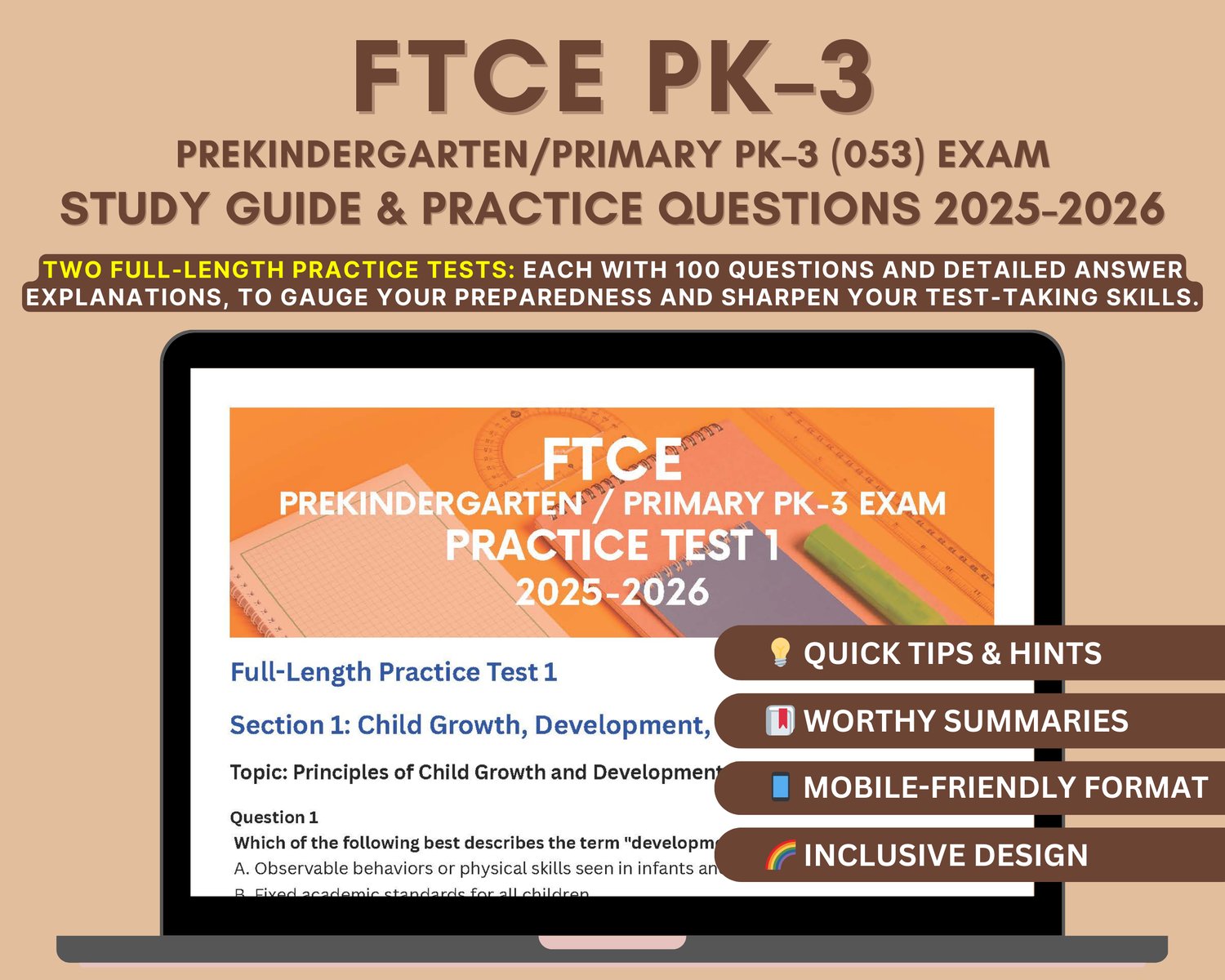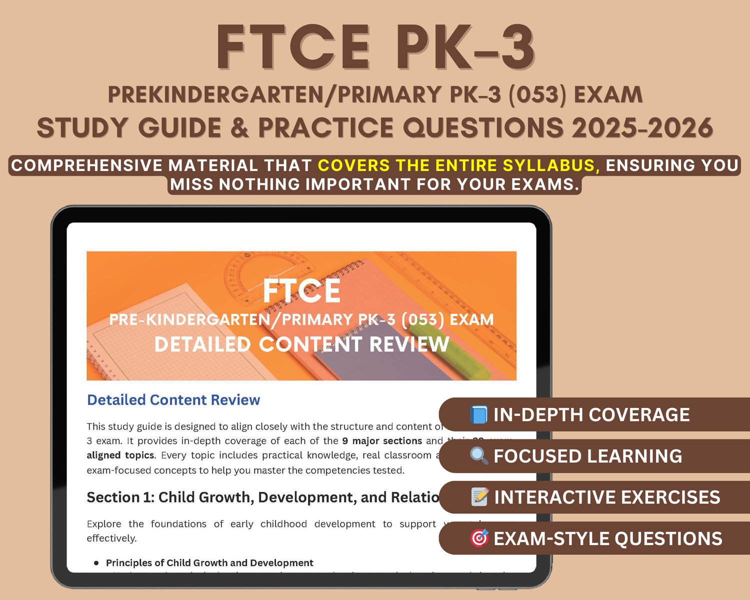 This FTCE PreKindergarten / Primary PK-3 Study Guide 2025-2026 is a complete, printable exam prep resource for aspiring Florida teachers. Whether you're pursuing your early childhood certification or need a reliable PK–3 exam review, this digital guide offers all the tools, strategies, and practice you need to succeed.
