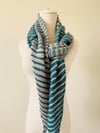A. The first scarf was knit from the same yarn in two different colours, starting with two full balls in each colour.