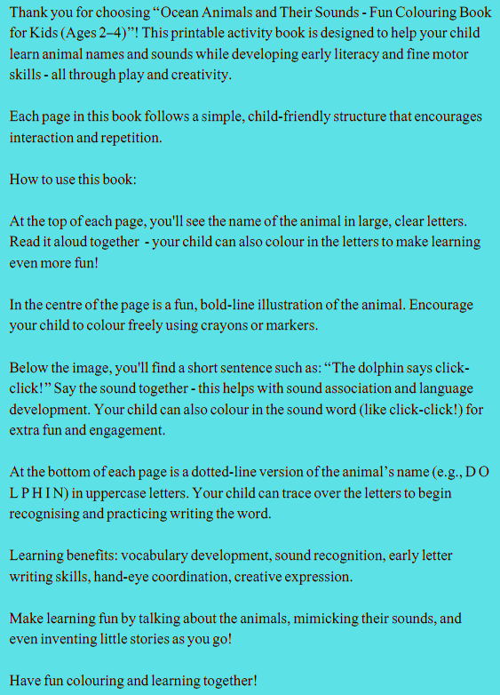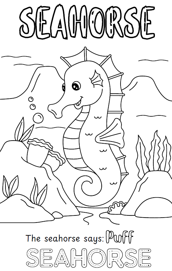 - At the bottom of each page is a dotted-line version of the animal’s name (e.g., D O L P H I N) in uppercase letters!