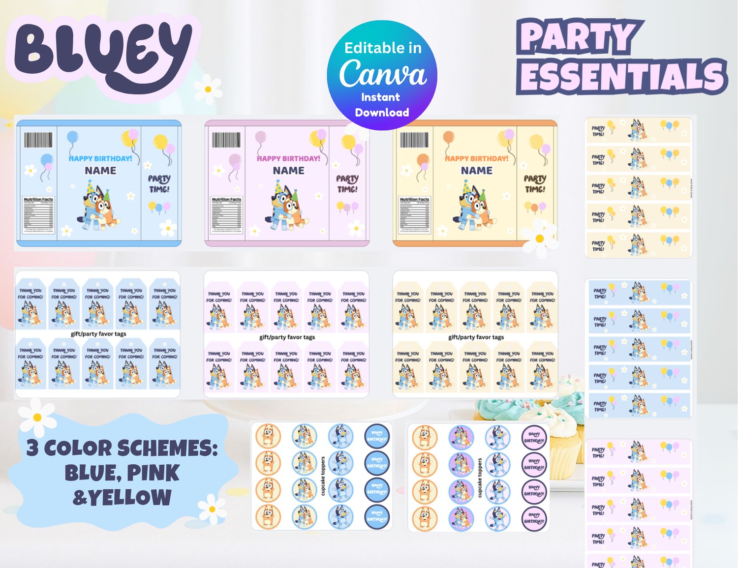 - 🎀 Bluey Party Essentials – Snack bag wrapper, water bottle labels, cupcake toppers, and thank you tags.