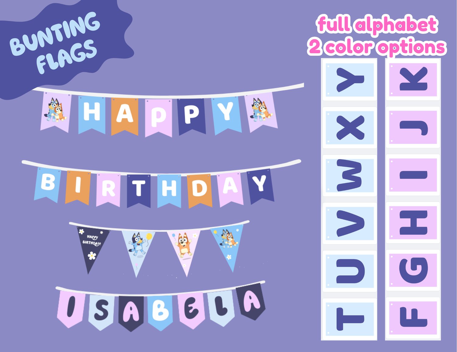- 🚩 Bluey Bunting – Cute flags featuring Bluey and Bingo, Happy Birthday, plus the full alphabet to customize your banner.