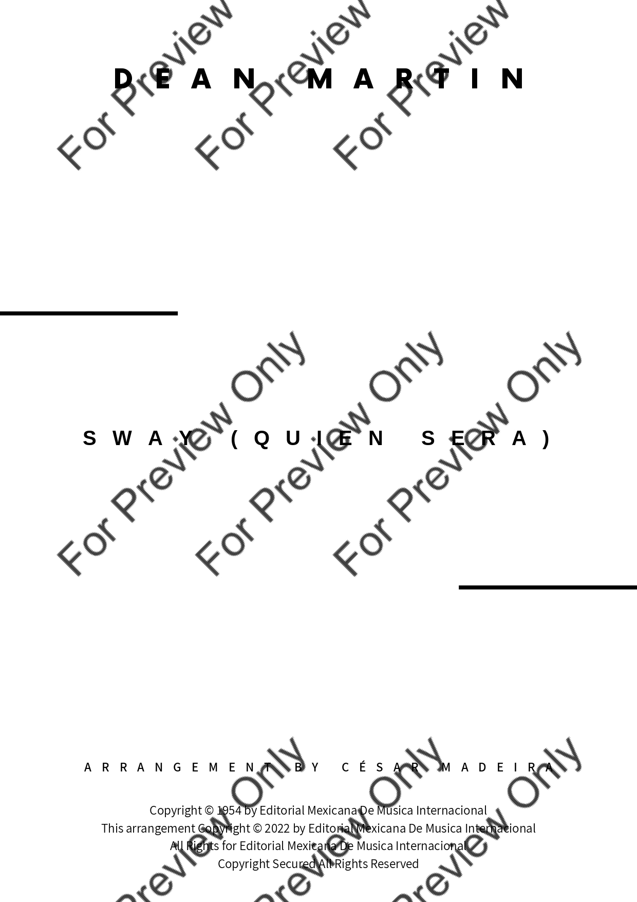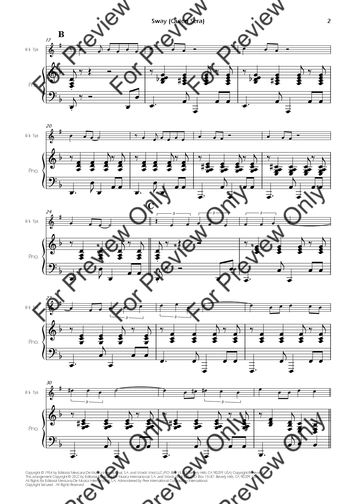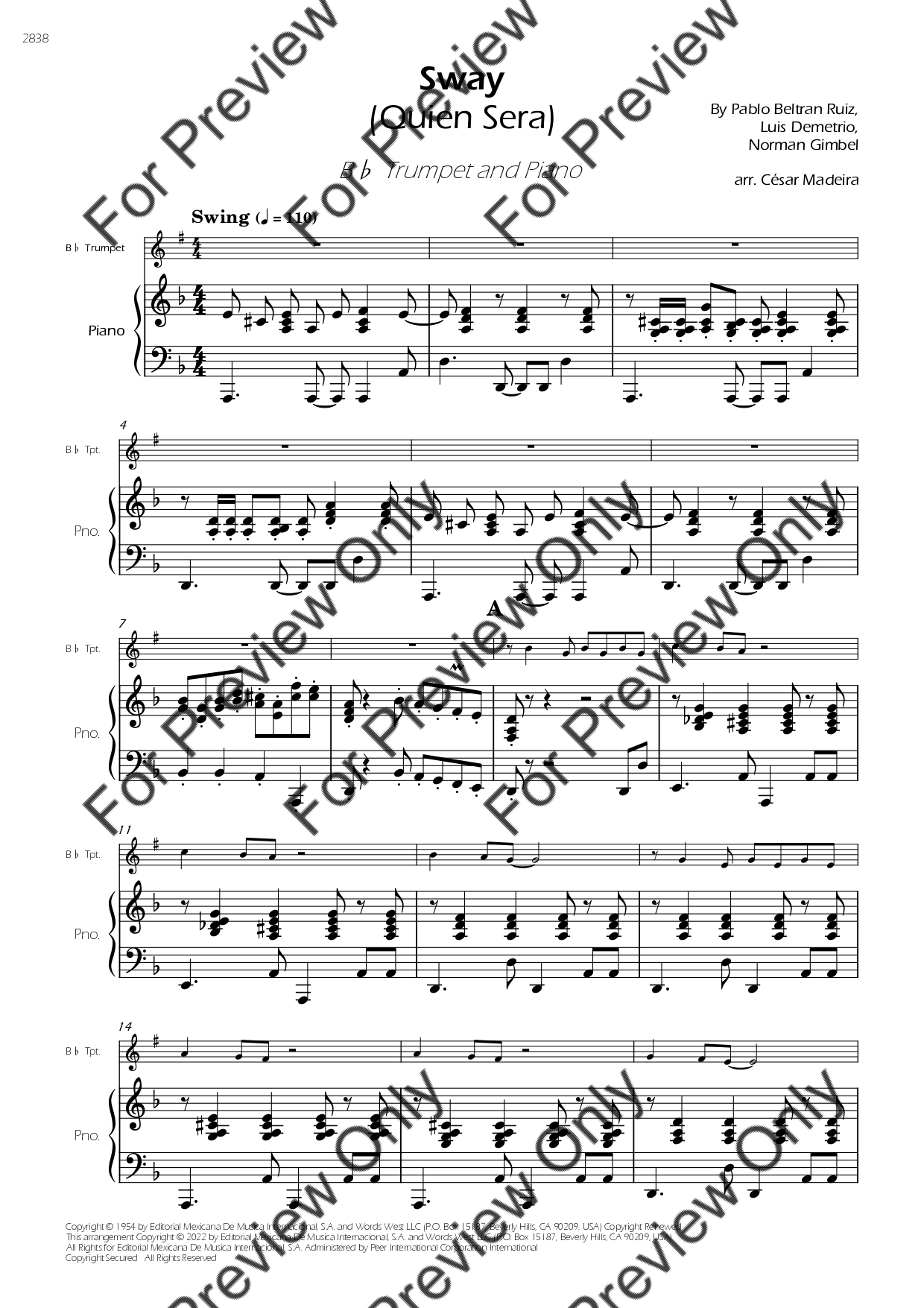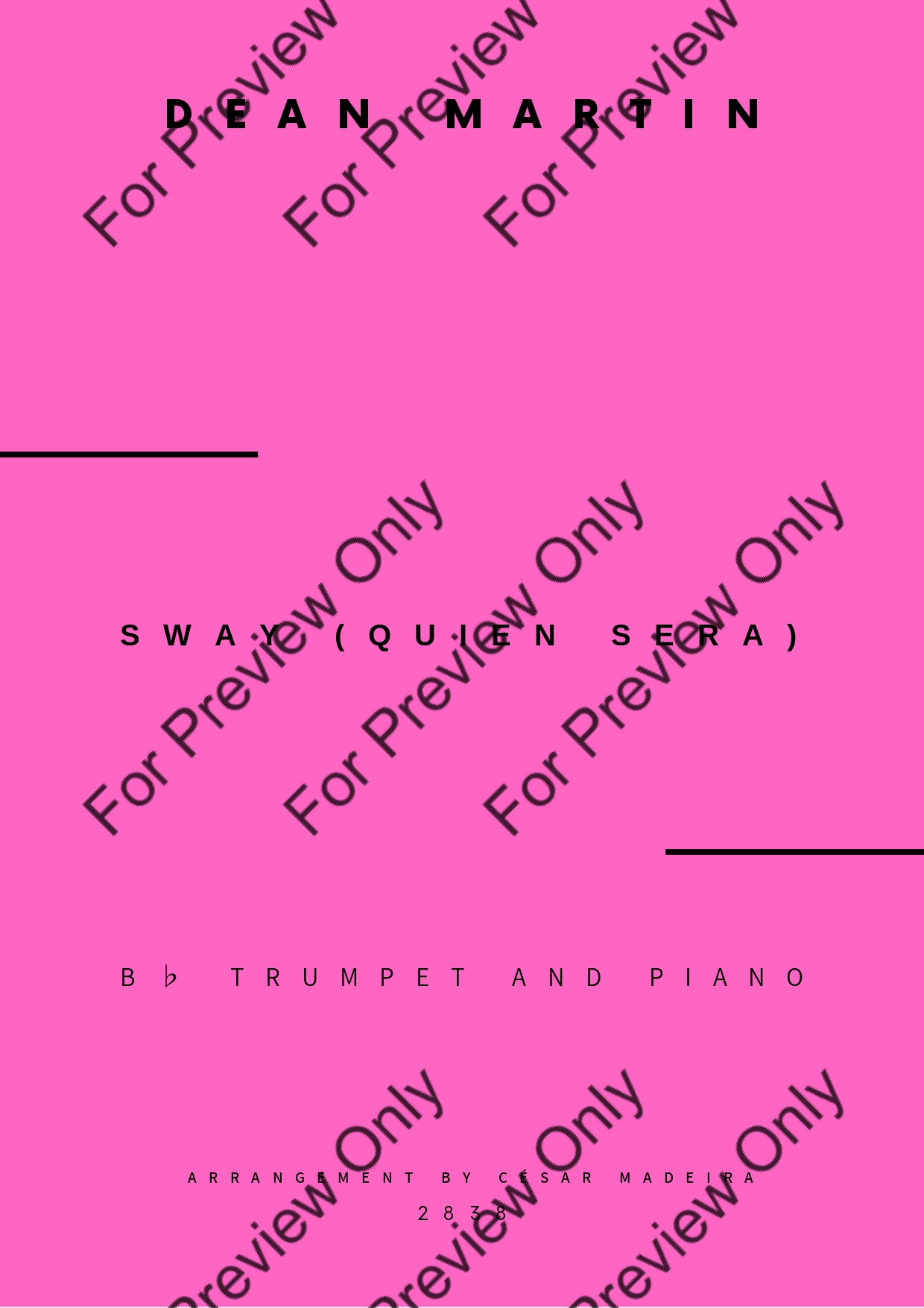 Sway (Quien Sera) by Dean Martin. Arrangement for Bb Trumpet and Piano. With Full Score and Individual Parts. Have fun!