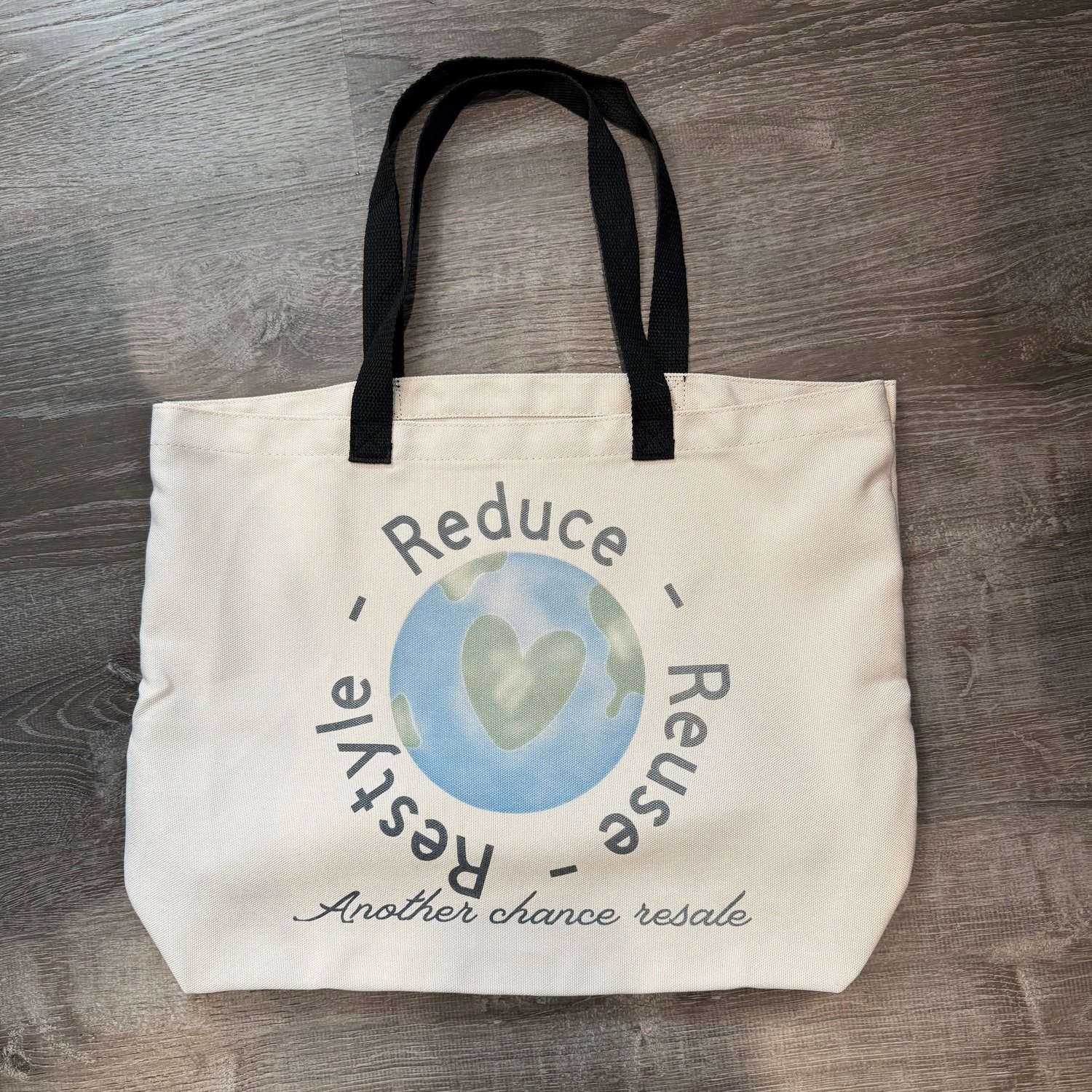 Reduce, Reuse, Restyle beige and black polyester tote bag