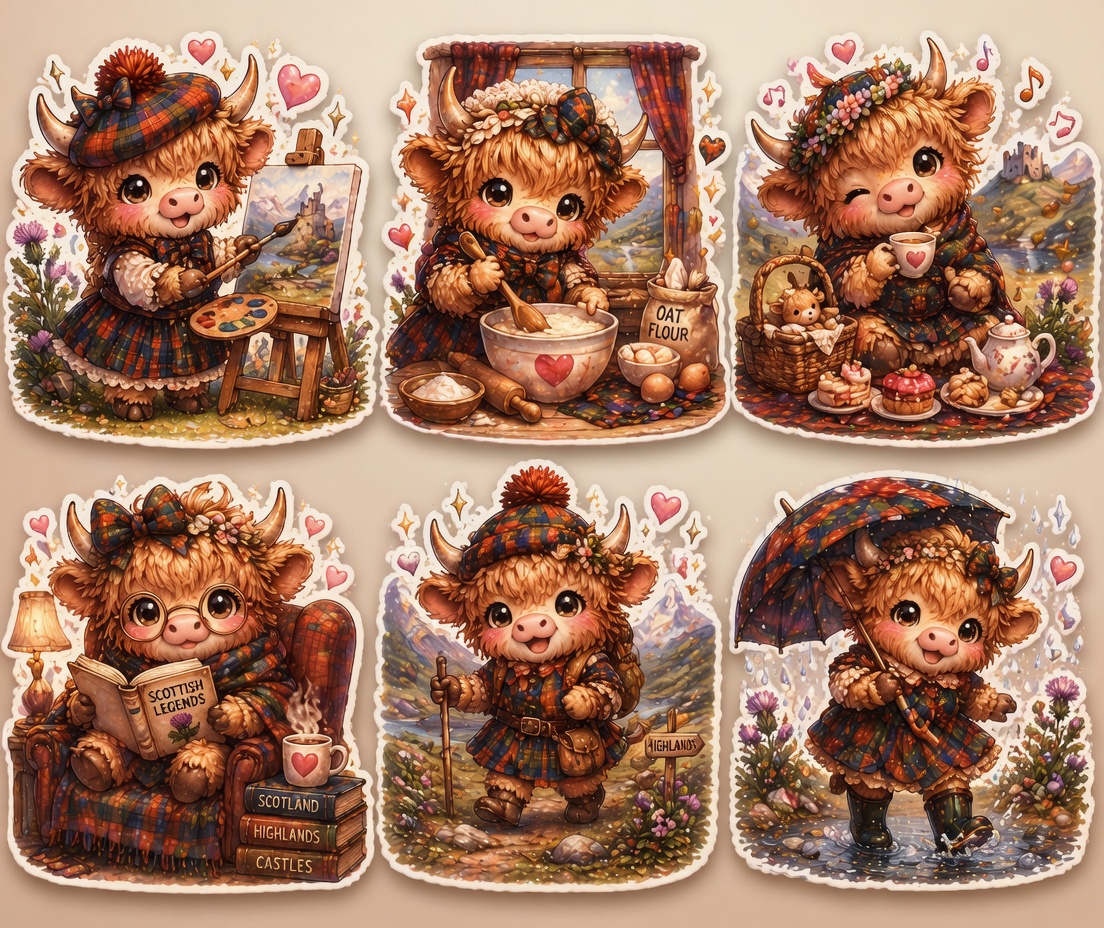 Fall in love with these adorable Highland Bull Boys, dressed in charming Scottish-inspired outfits! ๐Ÿ’• This 6-pack sticker collection features fluffy little bull wearing tartan dresses, cozy shawls, bows, and traditional accessoriesโ€”bringing a magical Highlands vibe to your creations.
