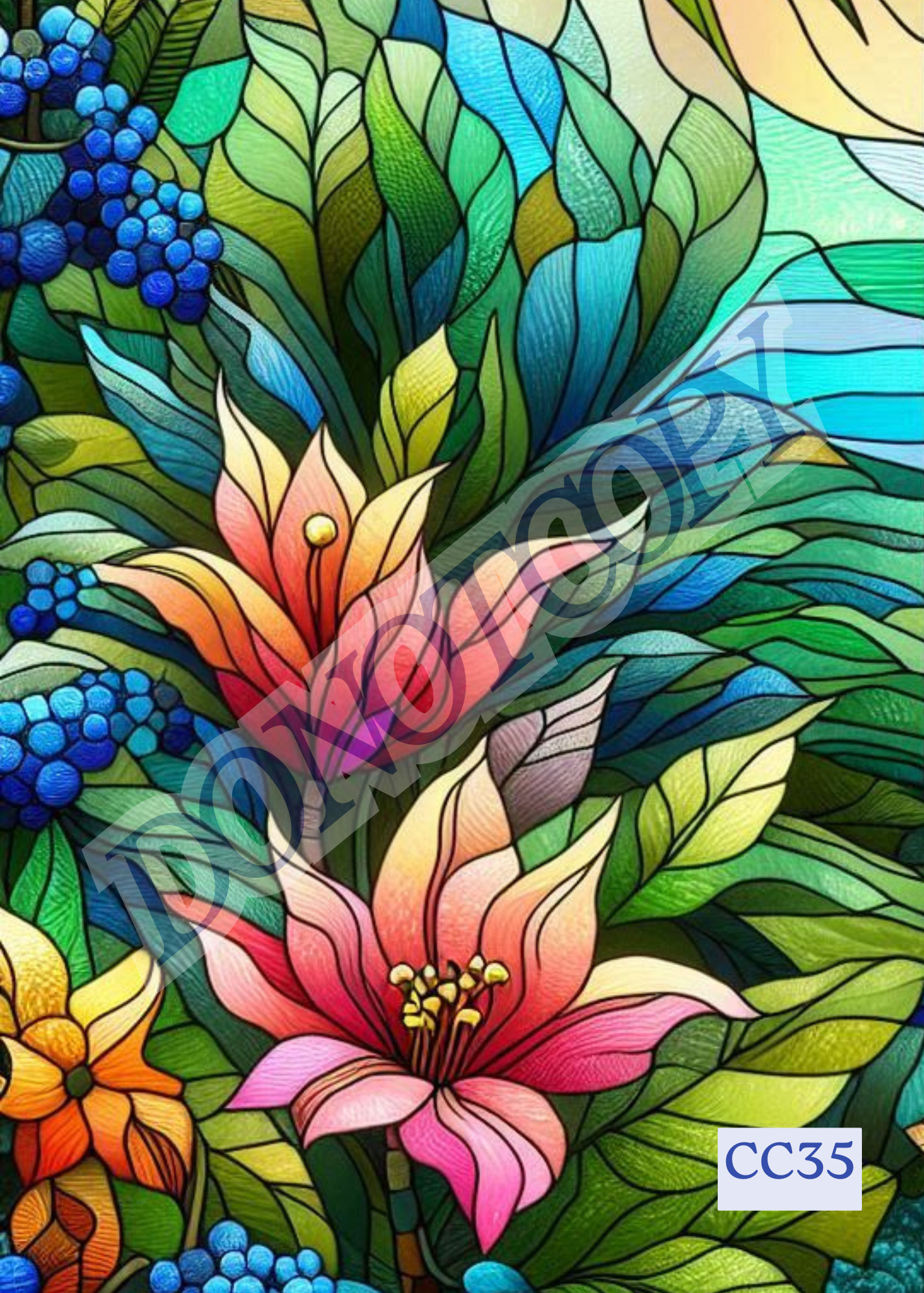 Tropical Bloom - Nestled in a sea of emerald leaves and sapphire berries, the flowers of Tropical Bloom emerge with confidence and grace. Their petals unfold like secrets, revealing layers of warmth and wonder. The composition pulses with life, a celebration of growth rooted in wild harmony. Each bloom tells a story of resilience. It shows how color can thrive even in tangled shade, and how stillness can carry vitality. This piece invites reflection on how beauty endures when nurtured, and how joy takes shape when we let nature lead.