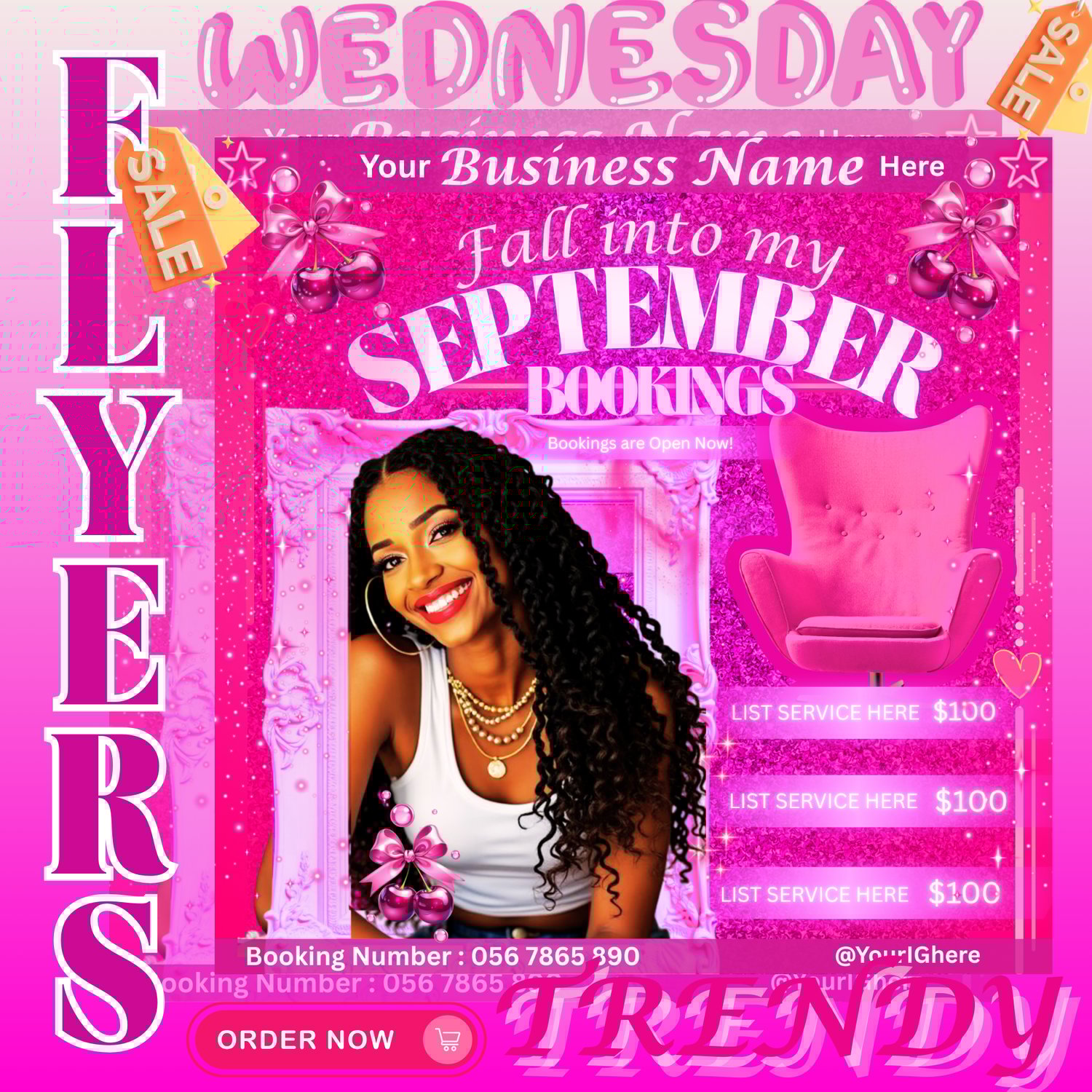 A September Booking Flyer is a digital, editable marketing template—often made in Canva—designed to help businesses (especially in beauty, hairstyling, lash/nail services, boutiques, events, etc.) announce availability, promotions, or "books are open" messaging for the month of September.
