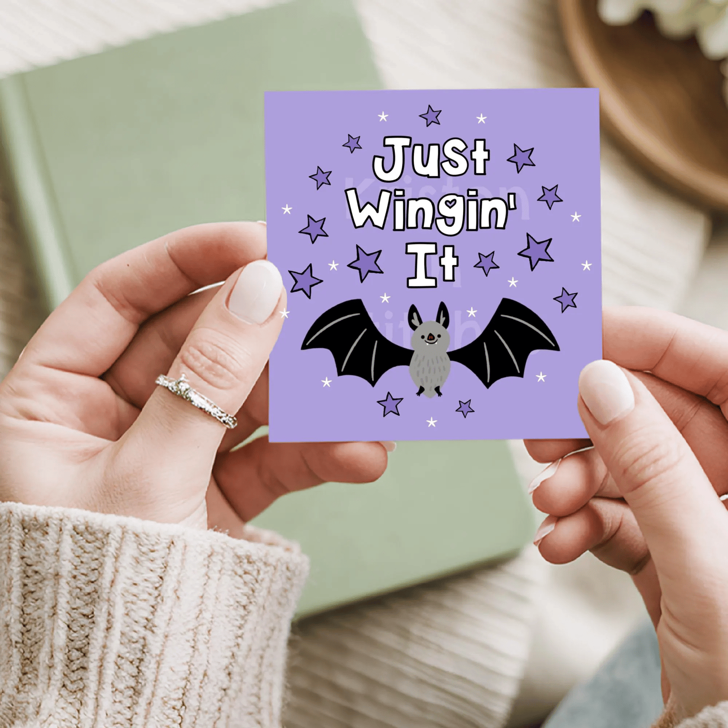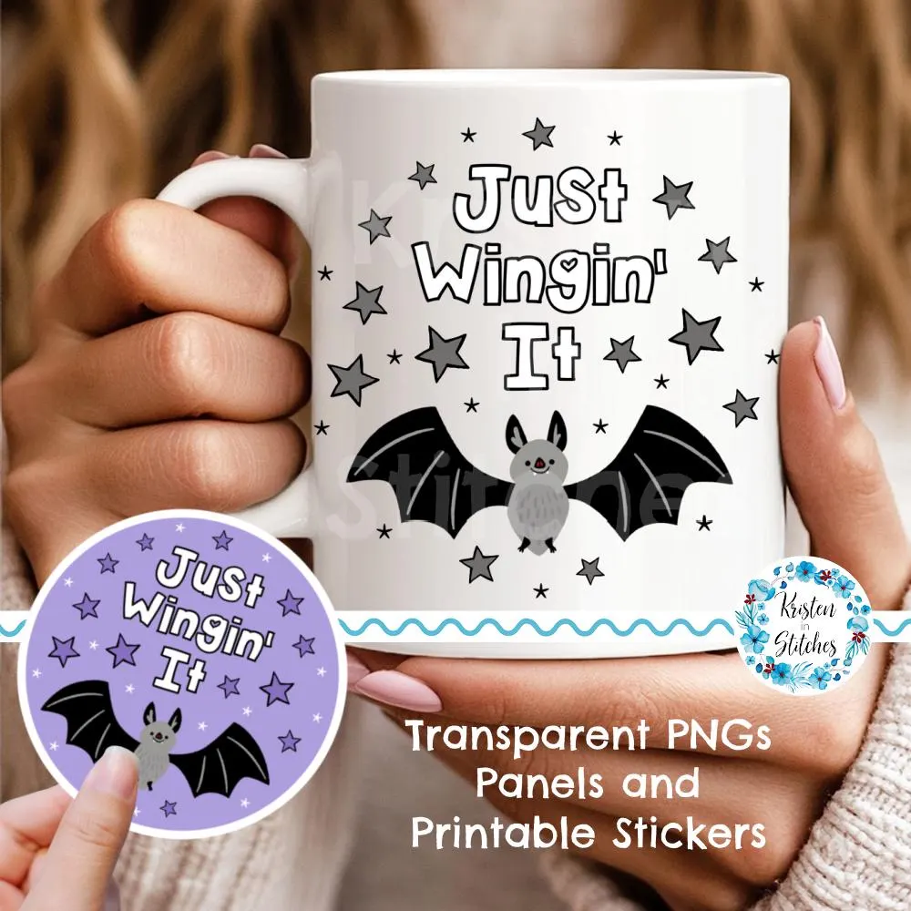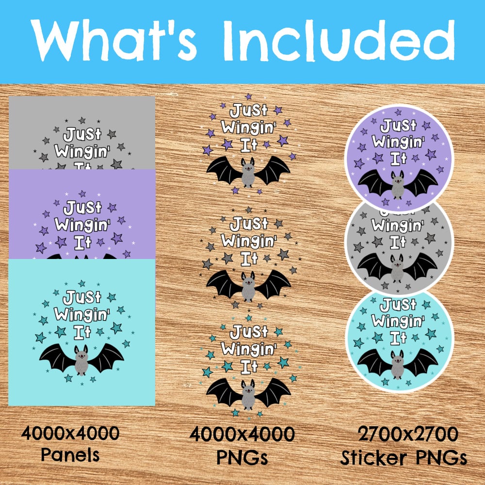 Just Wingin' It bats graphics for stickers, badge reels, jar and candle labels, uv dtf transfers, shirts, digital journals and so much more!