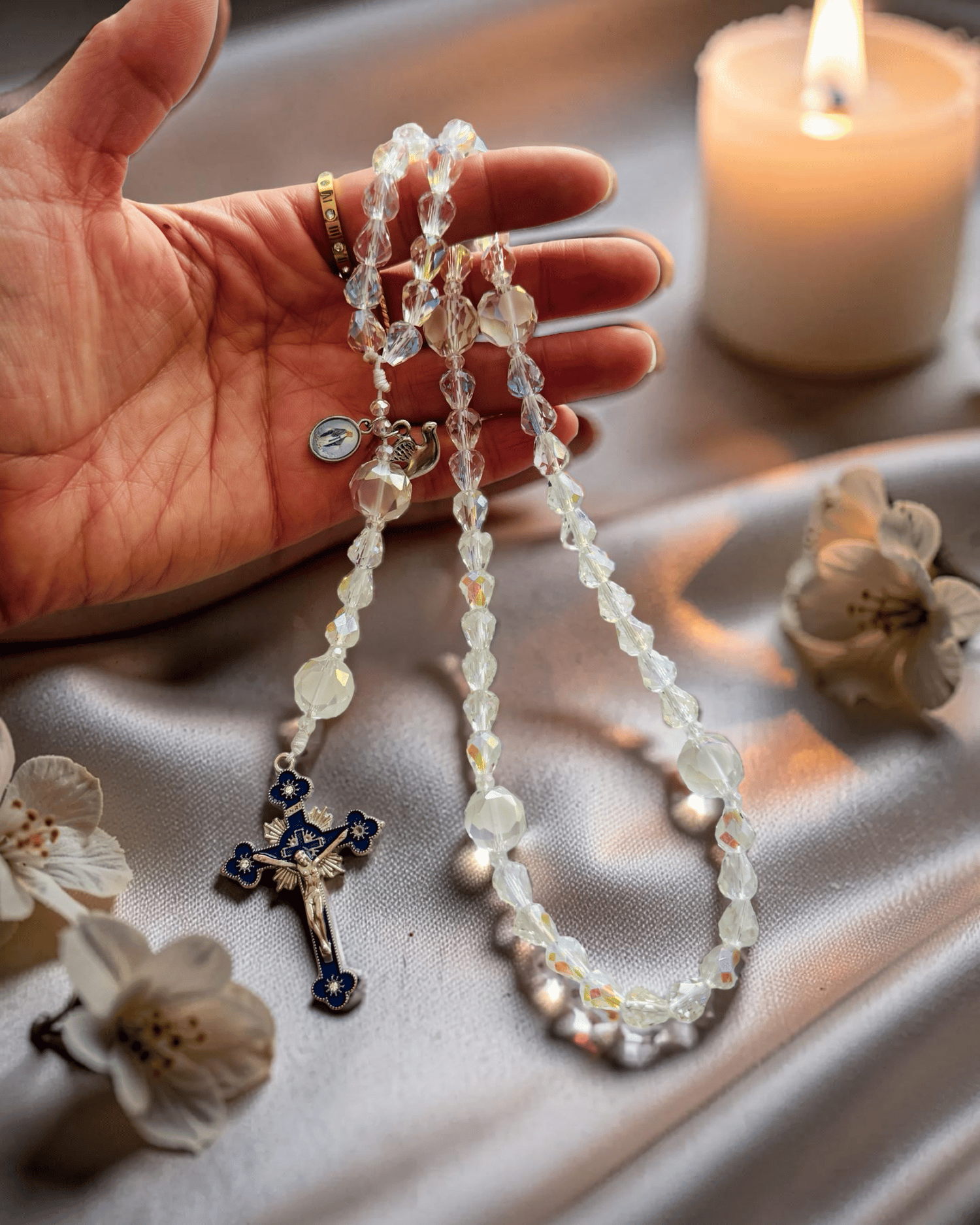 Exquisite handmade rosary featuring brilliant clear aurora borealis (AB) crystal beads with rainbow iridescence and larger faceted Our Father beads. Premium cord-based construction with stunning blue enamel crucifix featuring ornate gold detailing and traditional corpus. Elegant bridal-quality design that sparkles with divine light.
