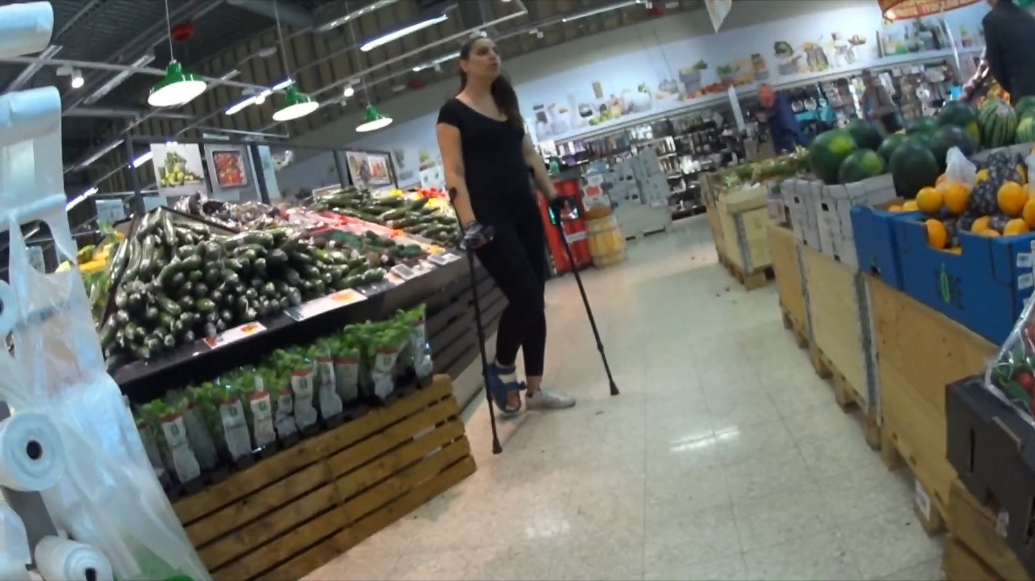Penelope is on her way to the food store. She is still crutching with her short leg cast but she has now put on a cast shoe so she can rest her cast on the floor.